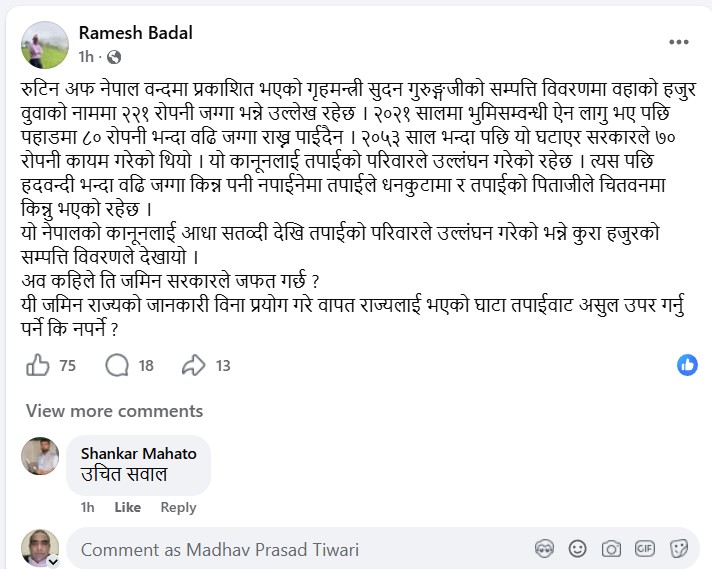 ३० चैत, काठमाडाैँ । पूर्व महान्यायाधिवक्ता रमेश बडालले गृहमन्त्री सुधन गुरूङको हदबन्दी भन्दा बढी जग्गा जफत गर्न माग गर्नुभएको छ । फेसबुकमा रूटिन अफ नेपाल बन्दमा प्रकाशित भएको गृहमन्त्रीको सम्पत्ति विवरण हेरेर छक्क पर्नुभएको बडालले दुई प्रश्न गर्नुभएको छ ।