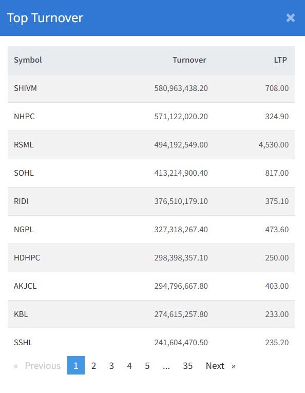 आज ३४४ कम्पनीको २ करोड ६४ लाख ३८ हजार ५२१ कित्ता सेयर किनबेच हुँदा १० अर्ब ५३ करोड ७० लाख ८ हजार रुपैयाँ बराबरको कारोबार भएको छ। आज शिवम् सिमेन्टको सेयर सर्वाधिक कारोबार भएको छ । आज कम्पनीको ५८ करोड ९ लाख ६३ हजार रुपैँया बराबरको कारोबार भएको छ । त्यस्तै, नेशनल हाइड्रोपावरको ५७ करोड ११ लाख २२ हजार रुपैयाँ बराबरको सेयर खरिद बिक्री भएको छ ।