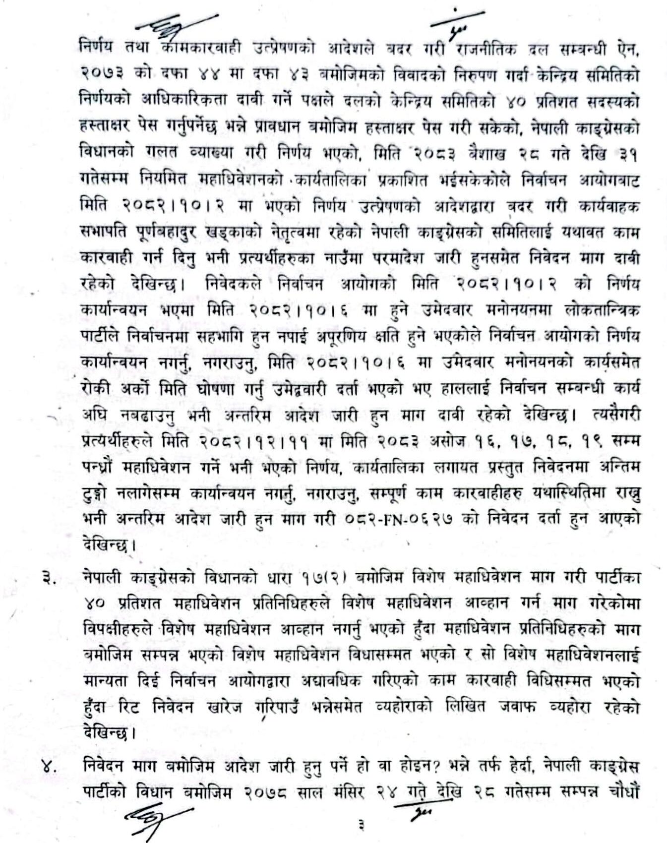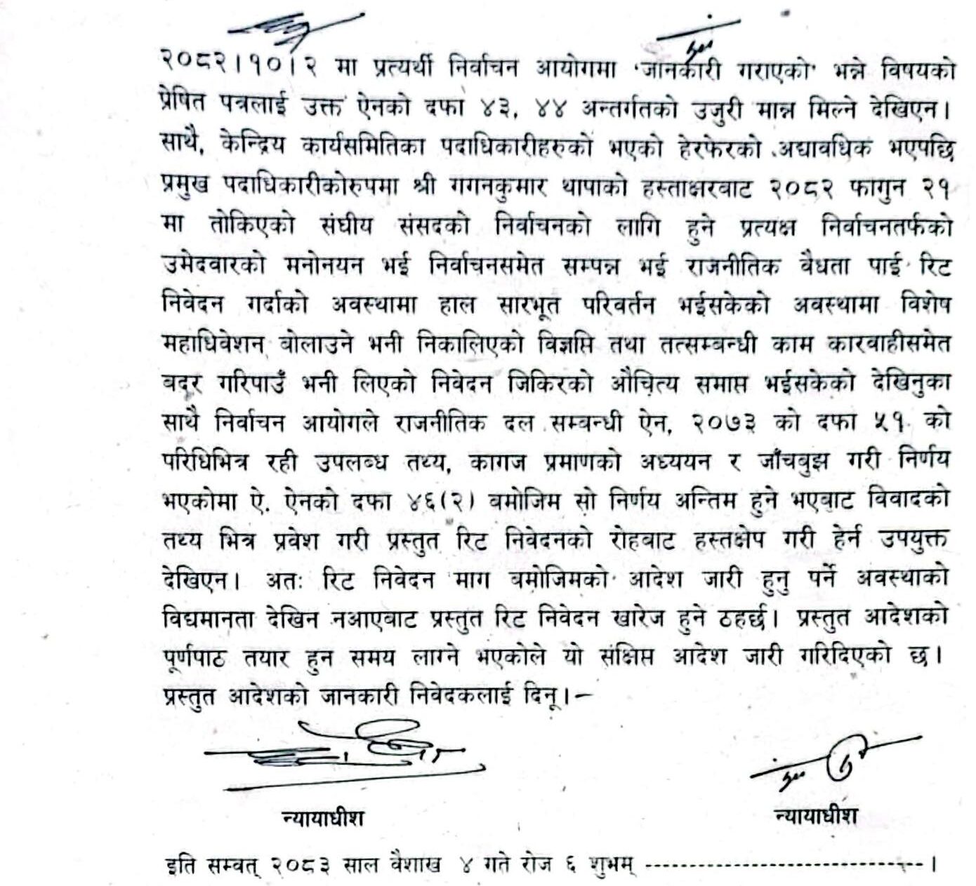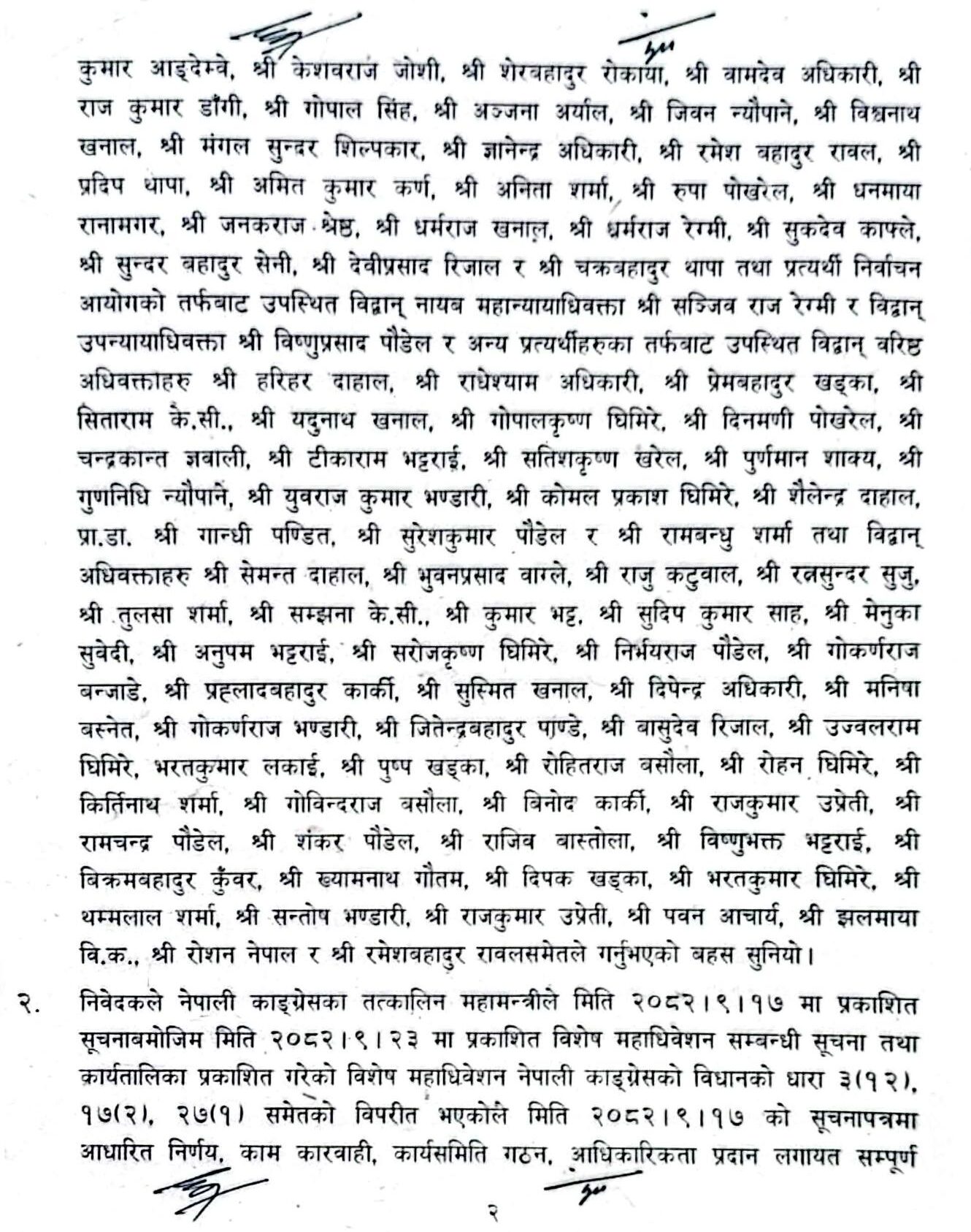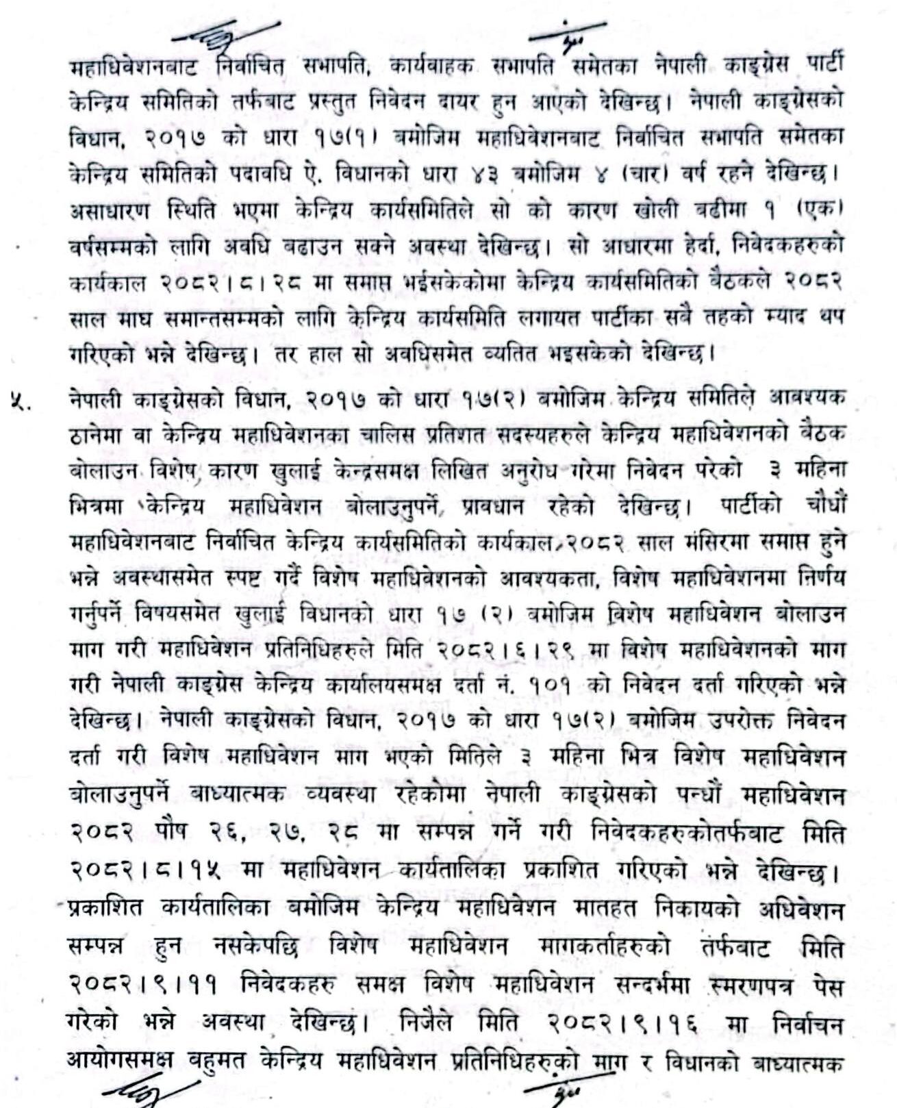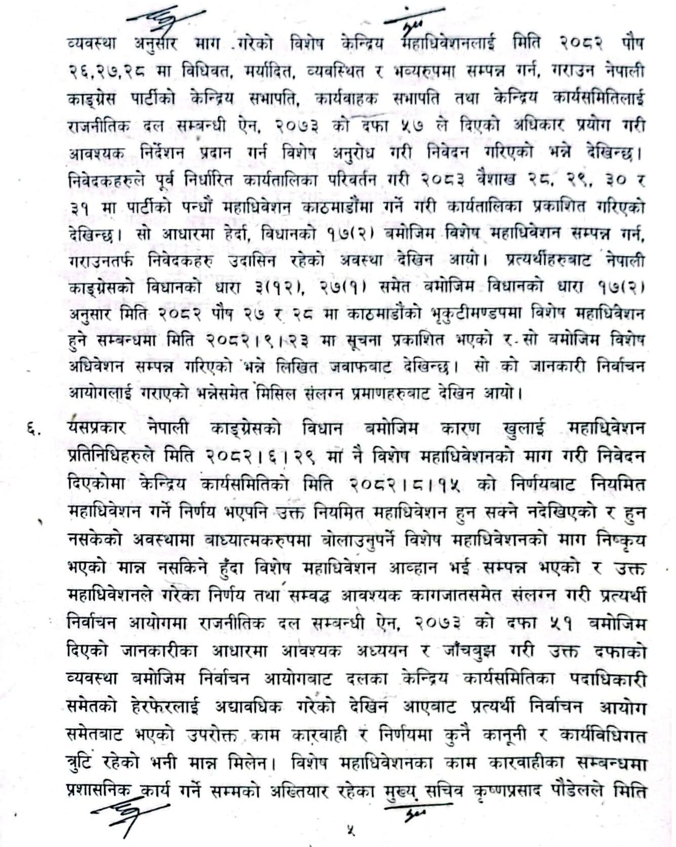 यसअघि निर्वाचन आयोगले विशेष महाधिवेशनबाट निर्वाचित भएको थापा नेतृत्वको कांग्रेसको केन्द्रीय समिति अध्यावधिक गर्ने निर्णय गरेको थियो । सर्वोच्चले सोही निर्णय सदर गरेको हो ।