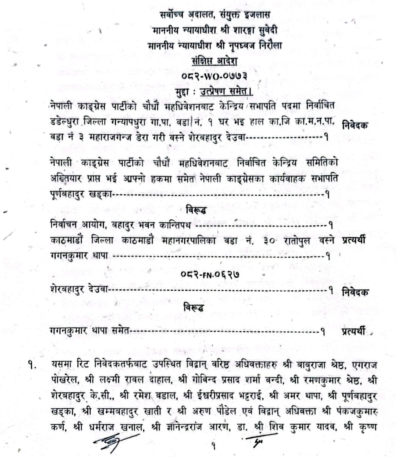 सर्वोच्चका न्यायाधीशद्वय शारंगा सुवेदी र नृपध्वज निरौलाको संयुक्त इजलासले यस्तो फैसला सुनाएको हो । यो फैसलासँगै अब शेरबहादुर देउवा समूहलाई नयाँ कांग्रेस गठन गर्ने बाटो खुला भएको छ । देउवा समूह स्तब्ध बनेको सर्वोच्को आदेश यस्तो छ ….