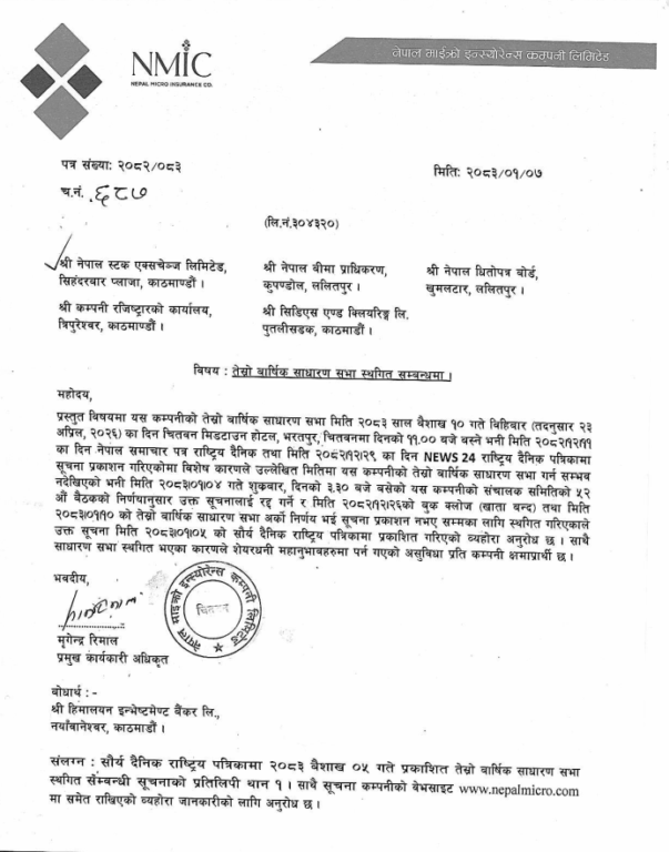 ७ वैशाख, काठमाडौं । नेपाल माइक्रो इन्स्योरेन्स कम्पनीकाे तेस्रो वार्षिक साधारणसभा स्थगित भएको छ । कम्पनीले यही वैशाख १० गते साधारणसभा आयोजना गर्ने निर्णय गरेको थियो । सभा चितवनको भरतपुरस्थित चितवन मिडटाउन होटलमा बिहान ११ बजे सभा हुने भनिएपनि स्थगित गरिएको हो ।