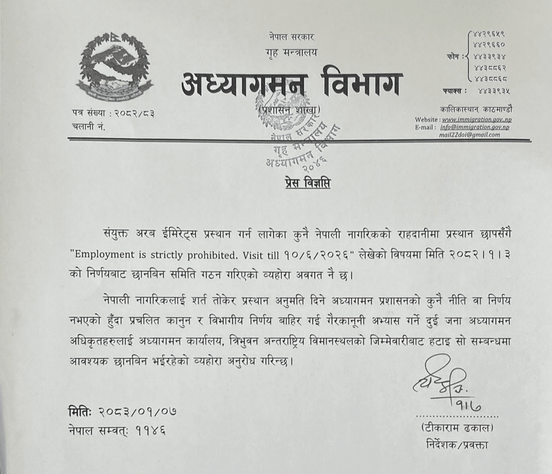 ७ वैशाख, काठमाडौं । संयुक्त अरब इमिरेट्स (यूएई) जान लागेका नेपाली नागरिकको राहदानी (पासपोर्ट) मा ‘रोजगारी निषेध’ सम्बन्धी छाप लगाएको विषयमा अध्यागमन विभागले दुई जना अधिकृतलाई कारबाही गरेको छ।