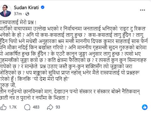 उहाँले सामाजिक सञ्जालमा लेख्नुभएकाे छ, ‘पार्टीको वाचापत्रमा उल्लेख भएको र निर्वाचनमा जनतालाई भनिएको ‘राइट टु रिकल’ भनेको के हो ? अनि यो कस-कसलाई लागू हुन्छ ? कस-कसलाई लागु हुँदैन ? लागू हुँदैन थियो भने मधेशी अनुहारका श्रम मन्त्री माननीय दिपक कुमार साहलाई सास फेर्न पनि मौका नदिई किन बर्खास्त गरियो ? अनि माननीय गृहमन्त्री सुदन गुरुङको बारेमा यो आकर्षित हुन्छ कि हुँदैन ? के एउटै कानुन जुङ्गा अनुसार लागु हुन्छ ? त्यसो भए गृहमन्त्रीको जुङ्गा कत्रो छ ? कति क्षेत्रमा फैलिएको छ ? र त्यसले कुन कुन सिमानाहरु नाघेको छ ? र मान्छेले प्रश्न उठाए जस्तै कुन-कुन शक्तिसँग त्यो जुङ्गाको जरा जोडिएको छ ? थप शङ्काको सुविधा प्राप्त नहोस् भनेर मैले रास्वपालाई यो प्रश्नहरू गरेको हुँ ! किनकि “यो देश मेरो पनि हो”
