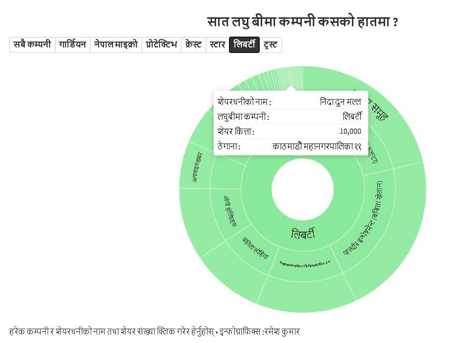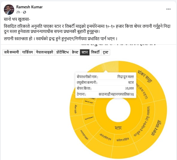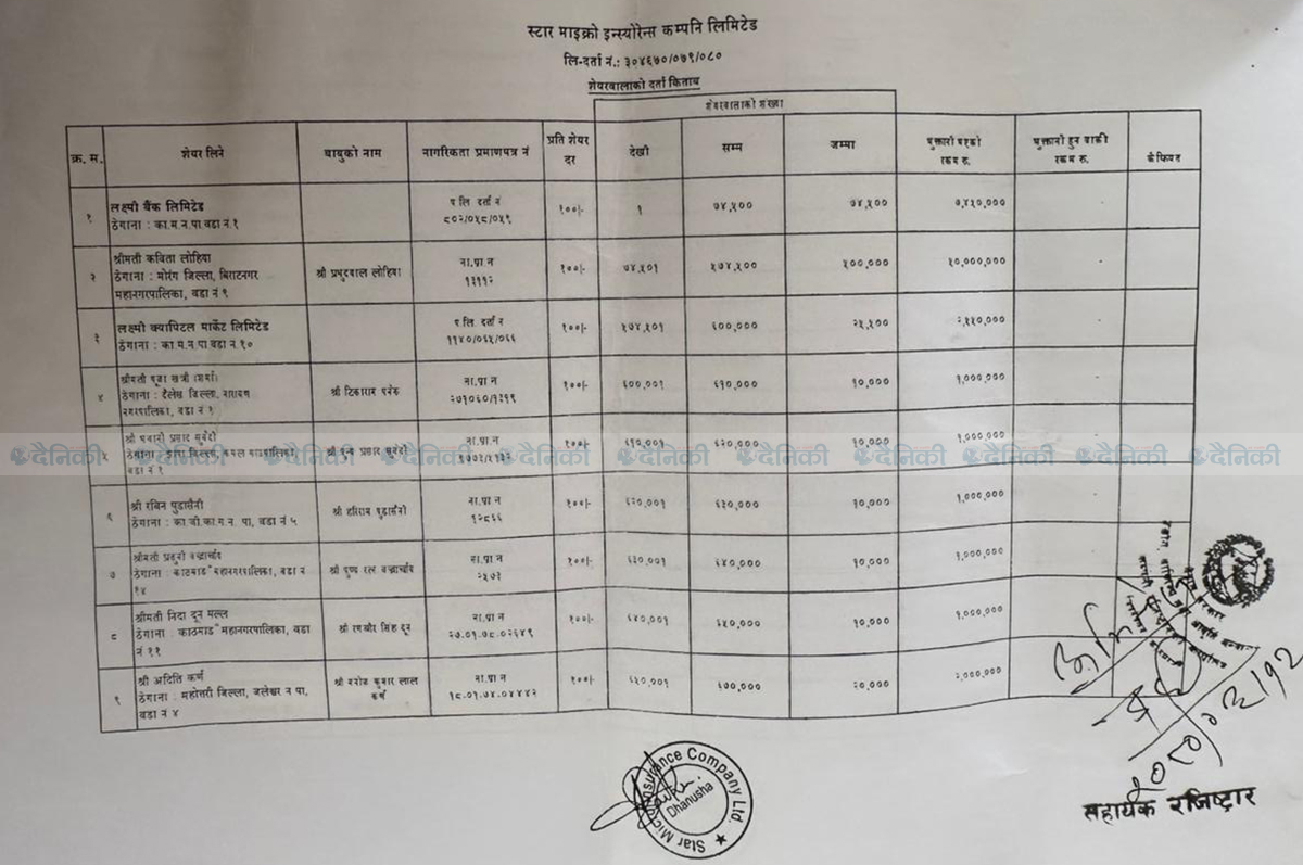 ९ वैशाख, काठमाडौँ । विवादित प्रक्रियाबाट अनुमति पाएका स्टार माइक्रो इन्स्योरेन्स र लिबर्टी माइक्रो लाइफ इन्स्योरेन्स कम्पनीमा कामु प्रधानन्यायाधीश सपना प्रधान मल्लको बुहारी निदा दुन मल्लको २० हजार कित्ता सेयर रहेको खुलासा भएको छ । हिमालखबरका लागि ‘लघु बीमामा एकाधिकार हुने गरी एकै समूहलाई लाइसेन्स’ शीर्षकको खोजी समाचार लेख्नुभएको रमेशकुमारले कामु प्रधानन्यायाधीश मल्लको स्टार माइक्रो इन्स्योरेन्स र लिबर्टी माइक्रो लाइफ इन्स्योरेन्समा १०/१० हजार कित्ता सेयर रहेको विवरण सार्वजनिक गर्नुभएको छ ।