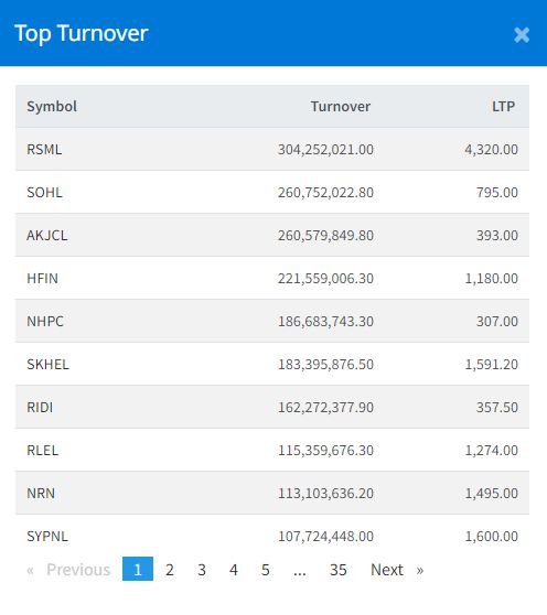 आज रिलायन्स स्पिनिङ मिल्सको सेयर सर्वाधिक कारोबार भएको छ । आज कम्पनीको ३० करोड ४२ लाख ५२ हजार रुपैँया बराबरको कारोबार भएको छ । त्यस्तै, सोलु हाइड्रोपावरको २६ करोड ७ लाख ५२ हजार रुपैयाँ , आँखुखोला जलविद्युत कम्पनीको २६ करोड ५ लाख ७९ हजार रुपैँया, होटल फरेस्ट इनको २२ करोड १५ लाख १५ हजार रुपैयाँ र नेशनल हाइड्रोपावरको १८ करोड ६६ लाख ८३ हजार रुपैयाँको कारोबार भएको छ ।