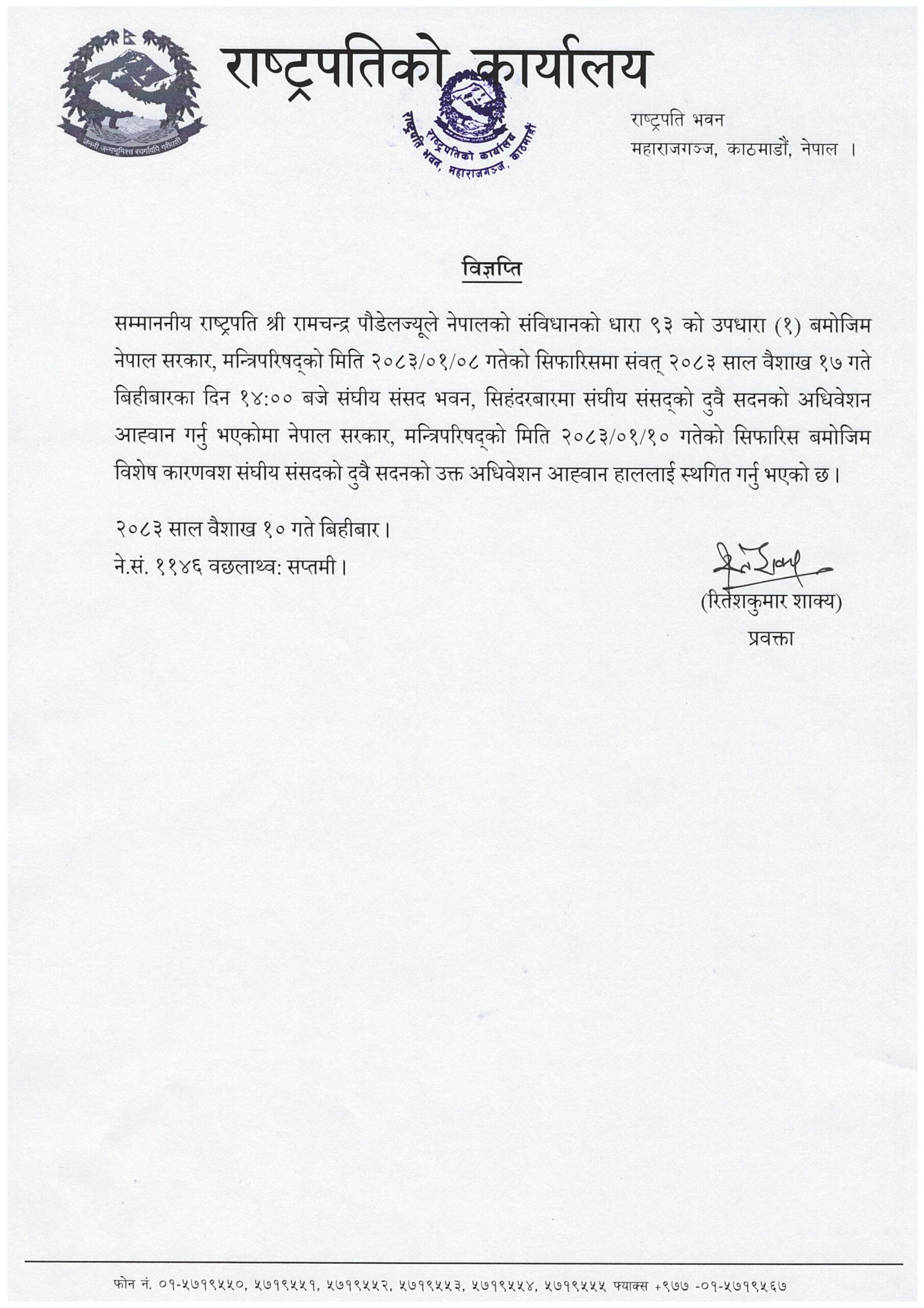 ‘राष्ट्रपति रामचन्द्र पौडेलज्यूले नेपालको संविधानको धारा ९३ को उपधारा (१) बमोजिम नेपाल सरकार, मन्त्रिपरिषद्को मिति २०८३/०१/०८ गतेको सिफारिसमा संवत् २०८३ साल वैशाख १७ गते बिहीबारका दिन १४:०० बजे संघीय संसद भवन, सिहंदरबारमा संघीय संसद्को दुवै सदनको अधिवेशन आह्वान गरेकोमा नेपाल सरकार, मन्त्रिपरिषद्को मिति २०८३/०१/१० गतेको सिफारिस बमोजिम विशेष कारणवश संघीय संसदको दुवै सदनको उक्त अधिवेशन आह्वान हाललाई स्थगित गर्नु भएको छ,’ विज्ञप्तिमा उल्लेख छ।