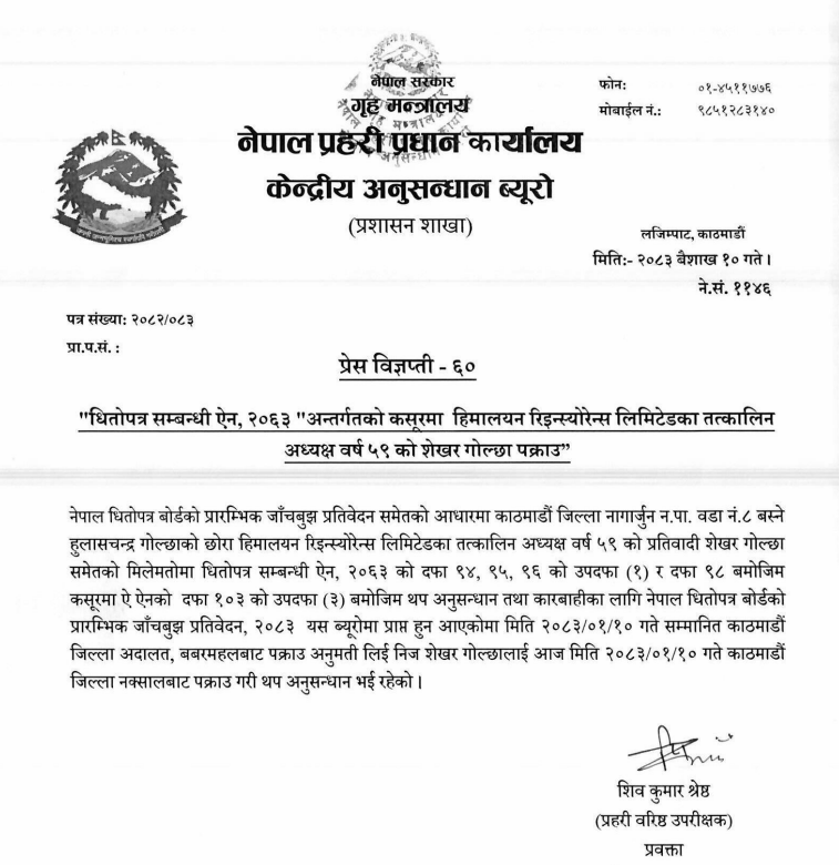 १० वैशाख, काठमाडाैँ । हिमालयन रिइन्स्योरेन्सका संस्थापक अध्यक्ष शेखर गोल्छा पक्राउ पर्नुभएको छ । प्रहरीको केन्द्रीय अनुसन्धान ब्यूरोले धितोपत्र सम्बन्धी कसुरमा कारबाहीका लागि पक्रउ गरेको जनाएको छ । गोल्छाका धितोपत्र सम्बन्धी कसुरका साझेदारहरू दीपक भट्ट र सुलभ अग्रवाल प्रहरी हिरासतमै रहनुभएको छ ।