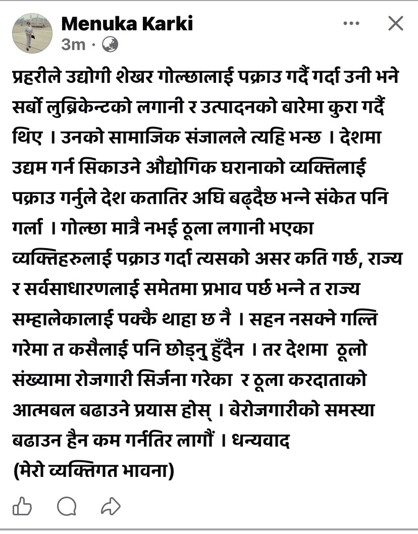 तर पत्रकारहरू पनि यस्तो कसुरमा गोल्छा पक्राउ पर्दा शोकमा परेको देखिन्छ । नाफिजको अध्यक्ष मेकुका कार्कीले फेसबुक गोल्छाको पक्राउबारे गरेको टिप्पणीमा भन्नुभएको छ, ‘प्रहरीले उद्योगी शेखर गोल्छालाई पक्राउ गर्दै गर्दा उनी भने सर्बो लुब्रिकेन्टको लगानी र उत्पादनको बारेमा कुरा गर्दै थिए । उनको सामाजिक संजालले त्यहि भन्छ । देशमा उद्यम गर्न सिकाउने औद्योगिक घरानाको व्यक्तिलाई पक्राउ गर्नुले देश कतातिर अघि बढ्दैछ भन्ने संकेत पनि गर्ला । गोल्छा मात्रै नभई ठूला लगानी भएका व्यक्तिहरुलाई पक्राउ गर्दा त्यसको असर कति गर्छ, राज्य र सर्वसाधारणलाई समेतमा प्रभाव पर्छ भन्ने त राज्य सम्हालेकालाई पक्कै थाहा छ नै । सहन नसक्ने गल्ति गरेमा त कसैलाई पनि छोड्नु् हुँदैन । तर देशमा ठूलो संख्यामा रोजगारी सिर्जना गरेका र ठूला करदाताको आत्मबल बढाउने प्रयास होस् । बेरोजगारीको समस्या बढाउन हैन कम गर्नतिर लागौं ।’