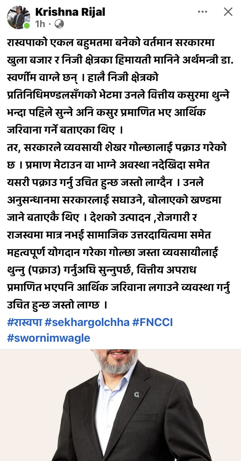 यस्तै सेजनका पूर्व सचिव कृष्ण रिजालले वित्तीय अपराध प्रमाणित भएपनि आर्थिक जरिवाना लगाउने व्यवस्था गर्नुपर्ने तर शेखर जस्ता व्यवसायी पक्राउ गर्न नहुने बताउनुभएको छ । उहाँले भन्नुभएको छ, ‘रास्वपाको एकल बहुमतमा बनेको वर्तमान सरकारमा खुला बजार र निजी क्षेत्रका हिमायती मानिने अर्थमन्त्री डा. स्वर्णीम वाग्ले छन् । हालै निजी क्षेत्रको प्रतिनिधिमण्डलसँगको भेटमा उनले वित्तीय कसुरमा थुन्ने भन्दा पहिले सुन्ने अनि कसुर प्रमाणित भए आर्थिक जरिवाना गर्ने बताएका थिए । तर, सरकारले व्यवसायी शेखर गोल्छालाई पक्राउ गरेको छ । प्रमाण मेटाउन वा भाग्ने अवस्था नदेखिदा समेत यसरी पक्राउ गर्नु उचित हुन्छ जस्तो लाग्दैन । उनले अनुसन्धानमा सरकारलाई सघाउने, बोलाएको खण्डमा जाने बताएकै थिए । देशको उत्पादन ,रोजगारी र राजस्वमा मात्र नभई सामाजिक उत्तरदायित्वमा समेत महत्वपूर्ण योगदान गरेका गोल्छा जस्ता व्यवसायीलाई थुन्नु (पक्राउ) गर्नुअघि सुन्नुपर्छ, वित्तीय अपराध प्रमाणित भएपनि आर्थिक जरिवाना लगाउने व्यवस्था गर्नु उचित हुन्छ जस्तो लाग्छ ।’