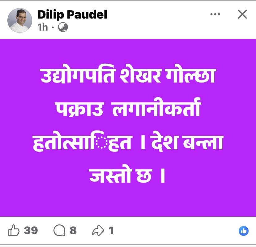 यस्तै प्रेस युनियनका महासचिव समेत रहनुभएको पत्रकार दिलिप पाैडेलले पनि शेखरको पक्राउले लगानीकर्ता हतोत्साहित भएको टिप्पणी गर्नुभएको छ । उहाँले देश बन्ला जस्तो छ भन्दै व्यंग्यात्मक टिप्पणी समेत गर्नुभएको छ ।