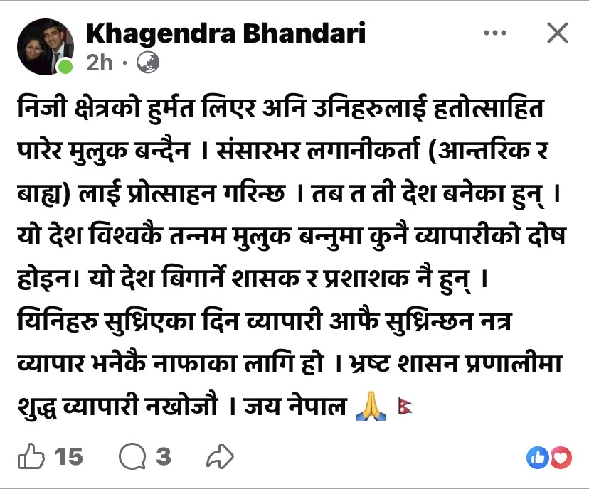 यस्तै विनोद चाैधरीको पूर्व स्वकीय सचिव पत्रकार खगेन्द्र भण्डारीले पनि देश विबार्ने शासक र प्रशासक रहेको भन्दै उनीहरू सुध्रिएको दिन शेखरहरू पनि सुध्रिने भएकाले त्यतै ध्यान दिनुपर्ने उल्लेख गर्नुभएको छ । उहाँले भन्नुभएको छ, ‘निजी क्षेत्रको हुर्मत लिएर अनि उनिहरुलाई हतोत्साहित पारेर मुलुक बन्दैन । संसारभर लगानीकर्ता (आन्तरिक र बाह्य) लाई प्रोत्साहन गरिन्छ । तब त ती देश बनेका हुन् । यो देश विश्वकै तन्नम मुलुक बन्नुमा कुनै व्यापारीको दोष होइन। यो देश बिगार्ने शासक र प्रशाशक नै हुन् । यिनिहरु सुध्रिएका दिन व्यापारी आफै सुध्रिन्छन नत्र व्यापार भनेकै नाफाका लागि हो । भ्रष्ट शासन प्रणालीमा शुद्ध व्यापारी नखोजौ । जय नेपाल ।’