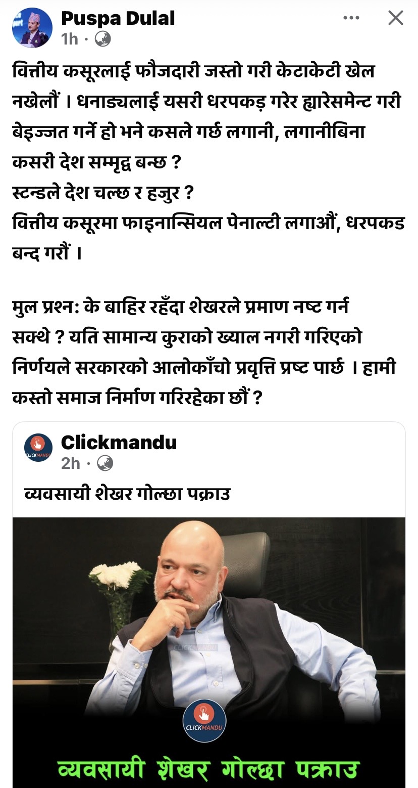 क्लिकमाण्डु डटकमका सञ्चालक समेत रहनुभएको पत्रकार पुष्प दुलालले शेखरमाथिको प्रहरी कारबाही केटाकेटी खेल भएको टिप्पणी गर्नुभएको छ । उहाँले स्टन्डले देश नचल्ने भन्दै देश चलाउने टिप्स समेत सिफारिस गर्दै भन्नुभएको छ, ‘वित्तीय कसूरलाई फौजदारी जस्तो गरी केटाकेटी खेल नखेलौं । धनाड्यलाई यसरी धरपकड़ गरेर ह्यारेसमेन्ट गरी बेइज्जत गर्ने हो भने कसले गर्छ लगानी, लगानीबिना कसरी देश सम्मृद्व बन्छ ? स्टन्डले देश चल्छ र हजुर ? वित्तीय कसूरमा फाइनान्सियल पेनाल्टी लगाऔं, धरपकड बन्द गरौं । मुल प्रश्न: के बाहिर रहँदा शेखरले प्रमाण नष्ट गर्न सक्थे ? यति सामान्य कुराको ख्याल नगरी गरिएको निर्णयले सरकारको आलोकाँचो प्रवृत्ति प्रष्ट पार्छ । हामी कस्तो समाज निर्माण गरिरहेका छौं ?
