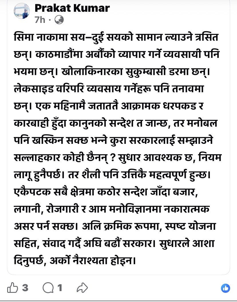 यस्तै सेजनका अध्यक्ष भागवत भट्टराईले रिजालकै टिप्पणीमा सहमति जनाउनुभएको छ । उहाँले विना कुनै टिप्पणी रिजालको पोस्ट फेसबुकमा सेयर गरेर दुःख बाड्नु भएको छ ।