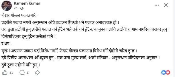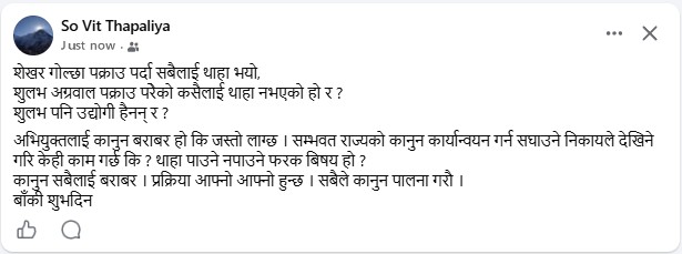 यस्तै सेजनाका पूर्व सचिव समेत रहनुभएको पत्रकार शोभित थपलियाले शेखर गोल्छा पक्राउ पर्दा थाहा पाउने पत्रकारले शुलभ अग्रवाल पक्राउ पर्दा किन थाहा पाएनन भनेर प्रश्न गर्नुभएको छ । उहाँले अभियुक्तलाई कानुन बराबर हुनुपर्ने बताउँदै भन्नुभएको छ, ‘शेखर गोल्छा पक्राउ पर्दा सबैलाई थाहा भयो, शुलभ अग्रवाल पक्राउ परेेको कसैलाई थाहा नभएको हो र ? शुलभ पनि उद्योगी हैनन् र ? अभियुक्तलाई कानुन बराबर हो कि जस्तो लाग्छ । सम्भवत राज्यको कानुन कार्यान्वयन गर्न सघाउने निकायले देखिने गरि केही काम गर्छ कि ? थाहा पाउने नपाउने फरक बिषय हो ? कानुन सबैलाई बराबर । प्रक्रिया आफ्नो आफ्नो हुन्छ । सबैले कानुन पालना गराैँ ।’