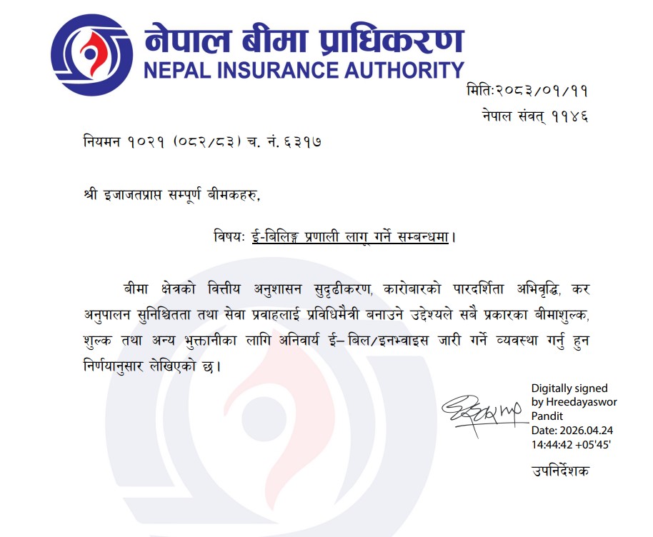 बीमा कम्पनीहरुलाई ई–बिलिङ्ग प्रणाली लागू गर्न प्राधिकरणको निर्देशन