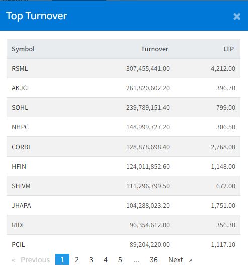 आज ३५१ कम्पनीको १ करोड ८ लाख ९९ हजार कित्ता सेयर किनबेच हुँदा ४ अर्ब ७३ करोड रुपैयाँको कारोबार भएको हो । सोमबार रिलायन्स स्पिनिङ मिल्सको सेयर सर्वाधिक कारोबार भएको छ । आज कम्पनीको ३० करोड ७१ लाख ८१ हजार रुपैँया बराबरको कारोबार भएको छ । त्यस्तै, आँखुखोला जलविद्युत कम्पनीको २५ करोड ९७ लाख १ हजार रुपैयाँ, सोलु हाइड्रोपावरको २३ करोड ९७ लाख ८१ हजार रुपैँया, नेशनल हाइड्रोपावरको १४ करोड ८९ लाख ९९ हजार रुपैयाँ र कर्पोरेट डेभलपमेन्ट बैंकको १२ करोड ८८ लाख ७८ हजार रुपैयाँको कारोबार भएको हो ।