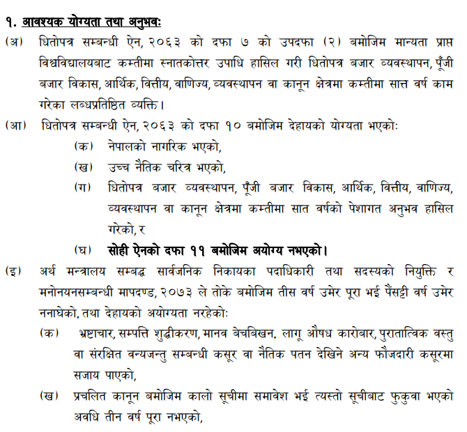 अध्यक्ष पदका लागि न्यूनतम स्नातकोत्तर उपाधि अनिवार्य गरिएको छ भने पूँजी बजार व्यवस्थापन, वित्तीय, आर्थिक, वाणिज्य, व्यवस्थापन वा कानून क्षेत्रमा कम्तीमा ७ वर्षको पेशागत अनुभव भएको हुनुपर्नेछ। साथै उच्च नैतिक चरित्र, पेशागत दक्षता तथा धितोपत्र सम्बन्धी ऐन, २०६३ अनुसार अयोग्य नभएको स्पष्ट मापदण्ड तोकिएको छ। उम्मेदवारको उमेर ३० वर्ष पूरा भई ६५ वर्ष ननाघेको हुनुपर्नेछ।