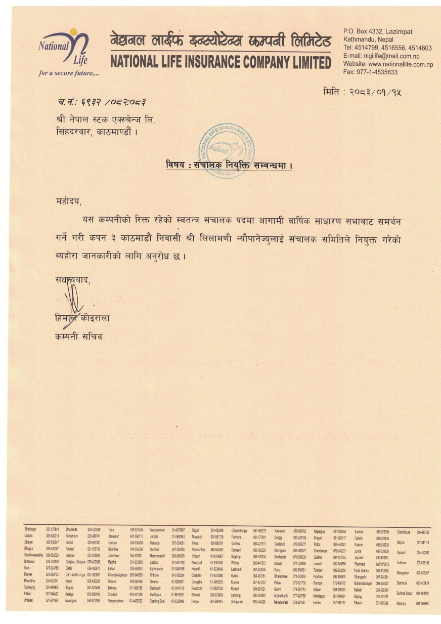 नेशनल लाईफ इन्स्योरेन्सको स्वतन्त्र सञ्चालकमा लिलामणि न्यौपाने नियुक्त