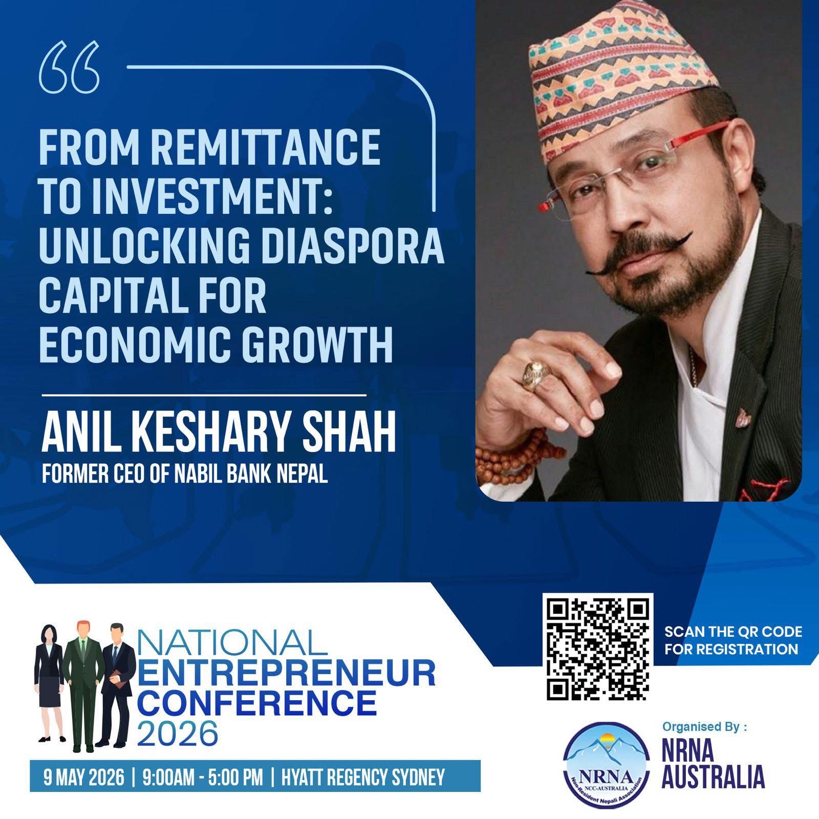 • अनिल केशरी शाह (प्रमुख वक्ता): नेपालका प्रख्यात बैंकर तथा ‘लिड नेपाल इन्क’ का चेयरपर्सन शाहले “रेमिटेन्सदेखि लगानीसम्म: आर्थिक वृद्धिका लागि डायस्पोरा पुँजीको परिचालन” विषयमा विशेष सम्बोधन गर्नेछन्। उनले विदेशमा आर्जित धनलाई नेपालको उत्पादक क्षेत्रमा कसरी रूपान्तरण गर्न सकिन्छ भन्नेबारे मार्गचित्र प्रस्तुत गर्नेछन्।