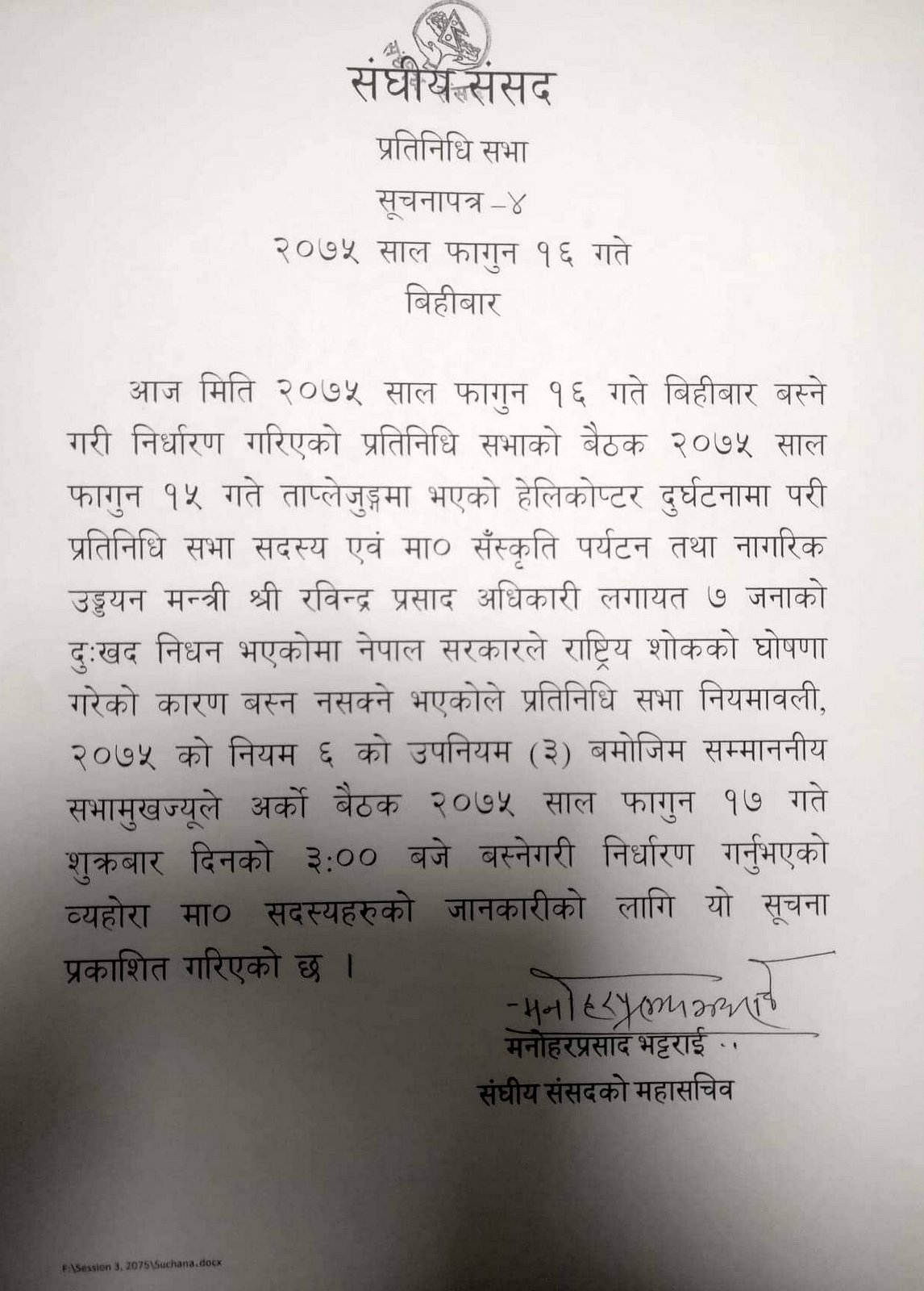 १६ फागुन, काठमाडाैँ । संस्कृति, पर्यटन तथा नगरिक उड्ययनमन्त्री रविन्द्र अधिकारीसहित सात जनाको हेलिकप्टर दुर्घटनामा मृत्यु भएको शोकमा सरकारले राष्ट्रिय शोकको घोषणा गरेका कारण अाजको प्रतिनिधिसभा बैठक सूचना टाँस गरी स्थगित गरिएको छ । शोकका कारण बैठक स्थगित गरिएको सूचनामा उल्लेख गरिएको छ ।