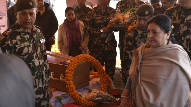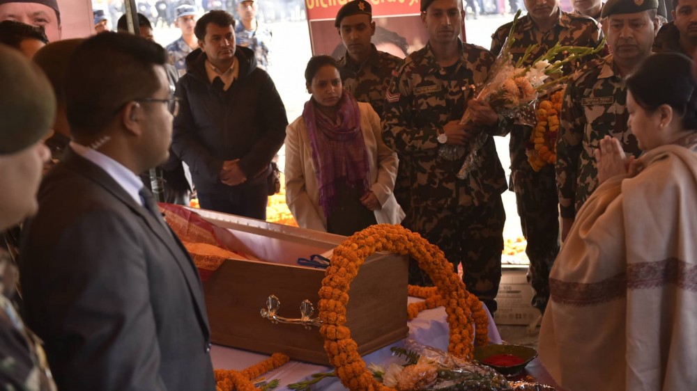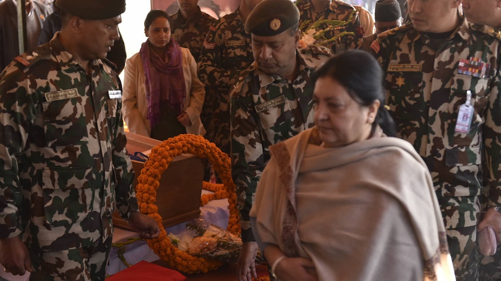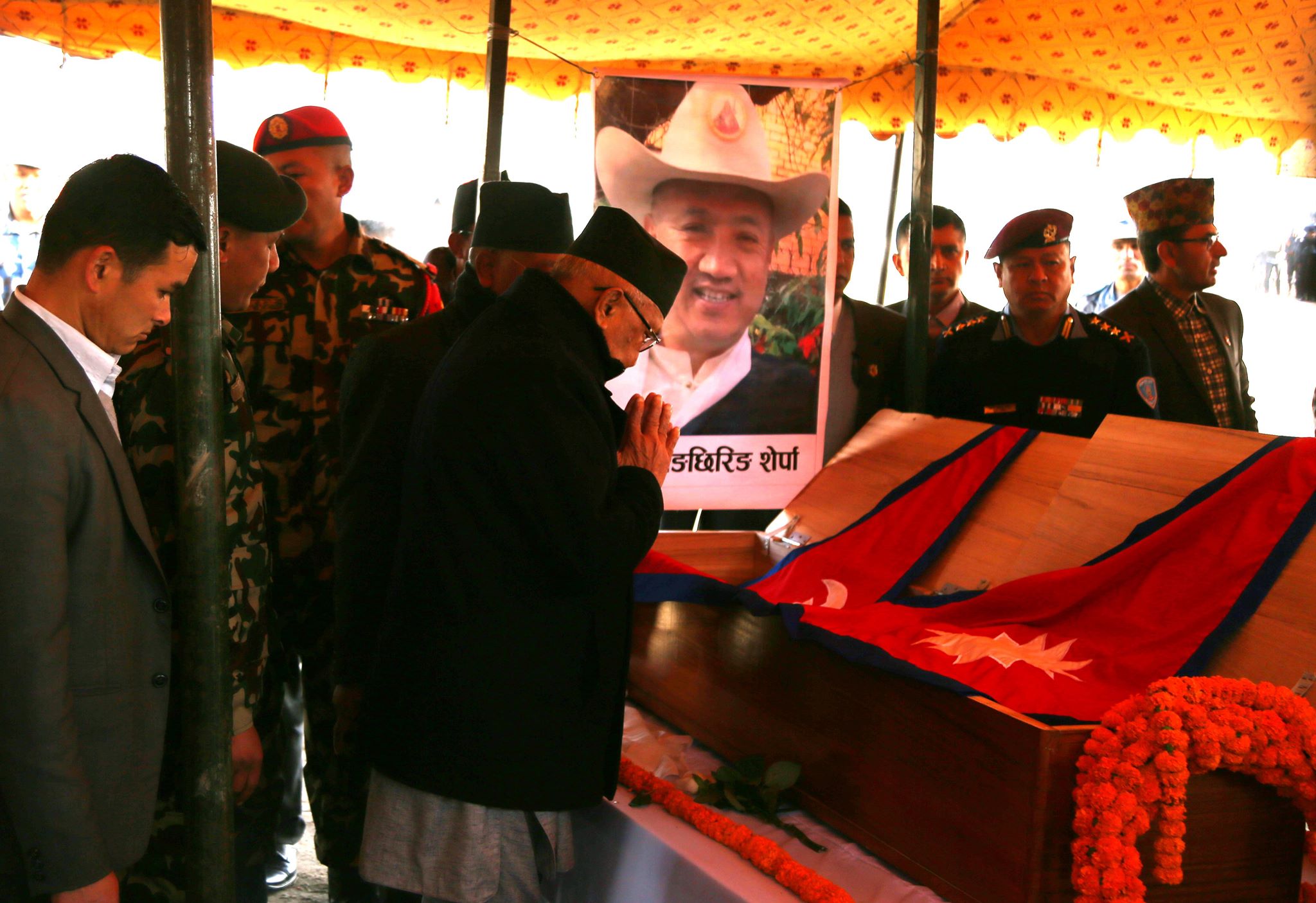 नेपाल कम्यूनिष्ट पार्टी (नकेपा)का नेता समेत रहेका अधिकारीलाई प्रधानमन्त्री एवं नेकपाका अध्यक्ष र अर्का अध्यक्ष पुष्पकमल दाहाल प्रचण्डले नेकपाको झण्डा ओडाउनुभएको छ । मृतकहरुलाई राष्ट्रपति विद्यादेवी भण्डारी,उपराष्ट्रपति नन्दबहादुर पुन,पूर्व प्रधानमन्त्रीहरु,मन्त्रीहरु,कर्मचारी,सुरक्षा निकाय,मृतकका आफन्त र सर्वसाधरणले श्रद्धान्जली अर्पण गरेका छन् । श्रद्धान्जलीका लागि शबहरुलाई बिहान ८ बजे देखि ११ बजेसम्म टुंडीखेलमा राखिने र त्यसपछि परिवारका सदस्यहरुलाई बुझाइने कार्यक्रम छ ।