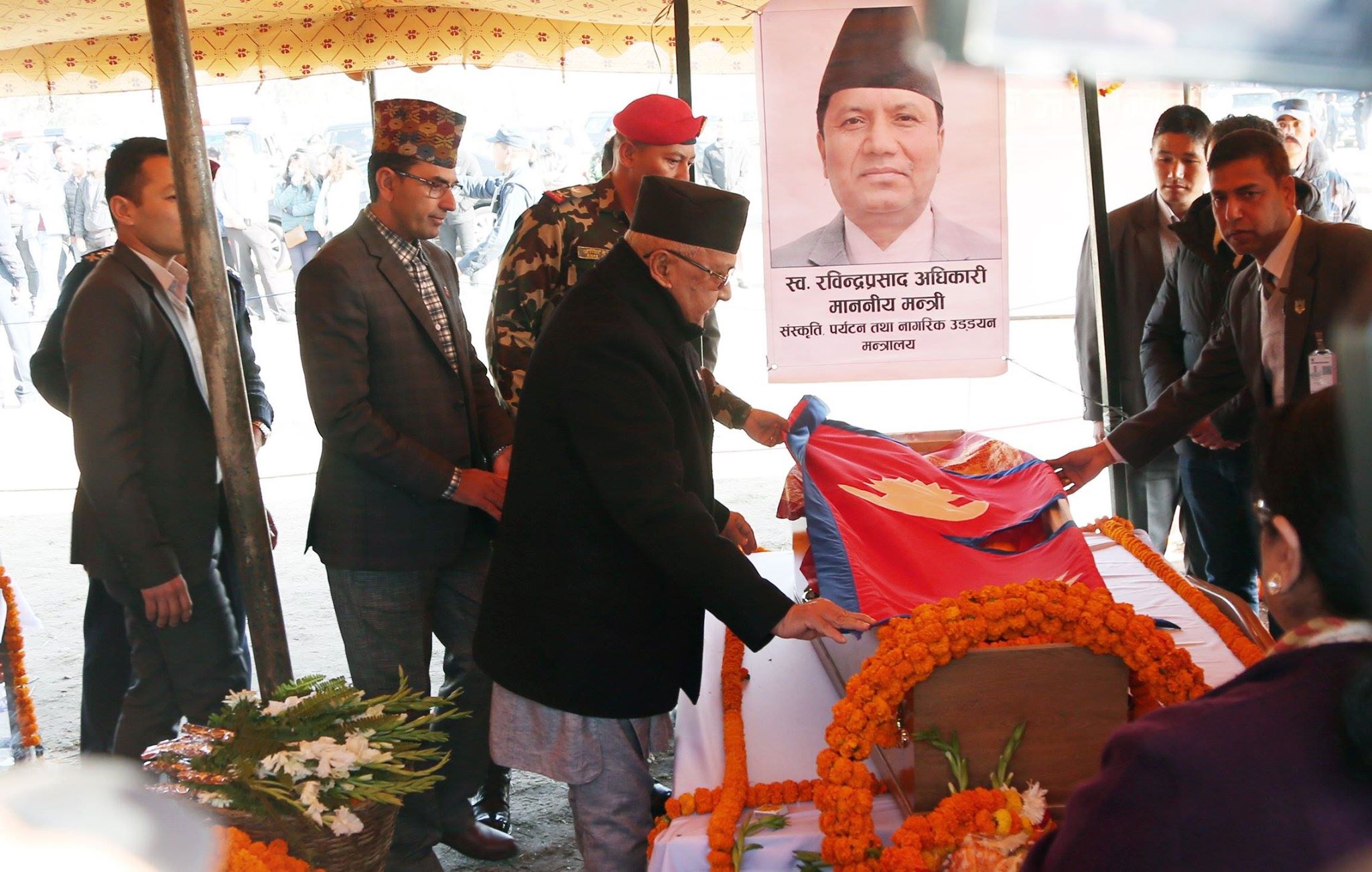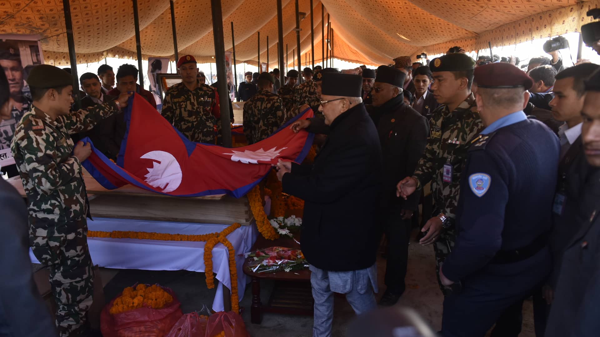 अधिकारीको पार्थिव शरिरमा प्रधानमन्त्री ओलीले राष्ट्रिय झण्डा र प्रचण्डले पार्टीको झण्डा ओढाए