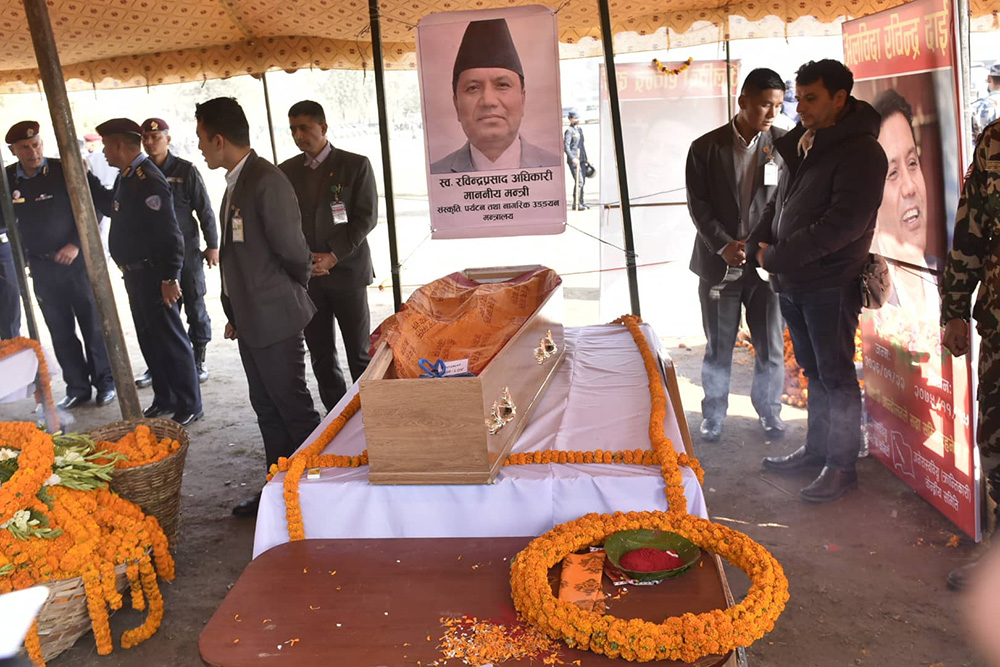 गत १५ गते ताप्लेजुङको पाथीभरा क्षेत्रमा मन्त्री अधिकारी सहित ७ जनाको निधन भएको थियो । मृतकको शब पहिचान भएपछि आज बिहान श्रद्धान्जलीका लागि टुंडीखेलमा राखिएको छ । दुर्घटनामा मन्त्री अधिकारी सहित प्रधानमन्त्री कार्यलयका उपसचिब युवराज दाहाल,पर्यटन व्यवसायी आङ छिरिङ शेर्पा, मन्त्री अधिकारीका सुरक्षा गार्ड अर्जुन घिमिरे,नागरिक उडड्यन प्राधिकरणका उपमहानिर्देशक बिरेन्द्र श्रेष्ठ, निर्देशक ध्रुव भोछिभोया र पाइलट प्रभाकर केसीको मृत्यू भएको थियो ।