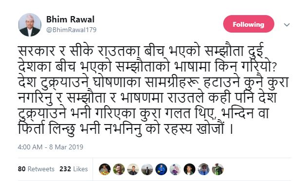 उनले भनेका छन ‘सरकार र सीके राउतका बीच भएको सम्झौता दुई देशका बीच भएको सम्झौताको भाषामा किन गरियो रु देश टुक्र्याउने घोषणाका सामग्रीहरू हटाउने कुनै कुरा नगरिनु र सम्झौता र भाषणमा राउतले कहीँ पनि देश टुक्र्याउने भनी गरिएका कुरा गलत थिए, भन्दिन वा फिर्ता लिन्छु भनी नभनिनुको रहस्य खोजौं ।’