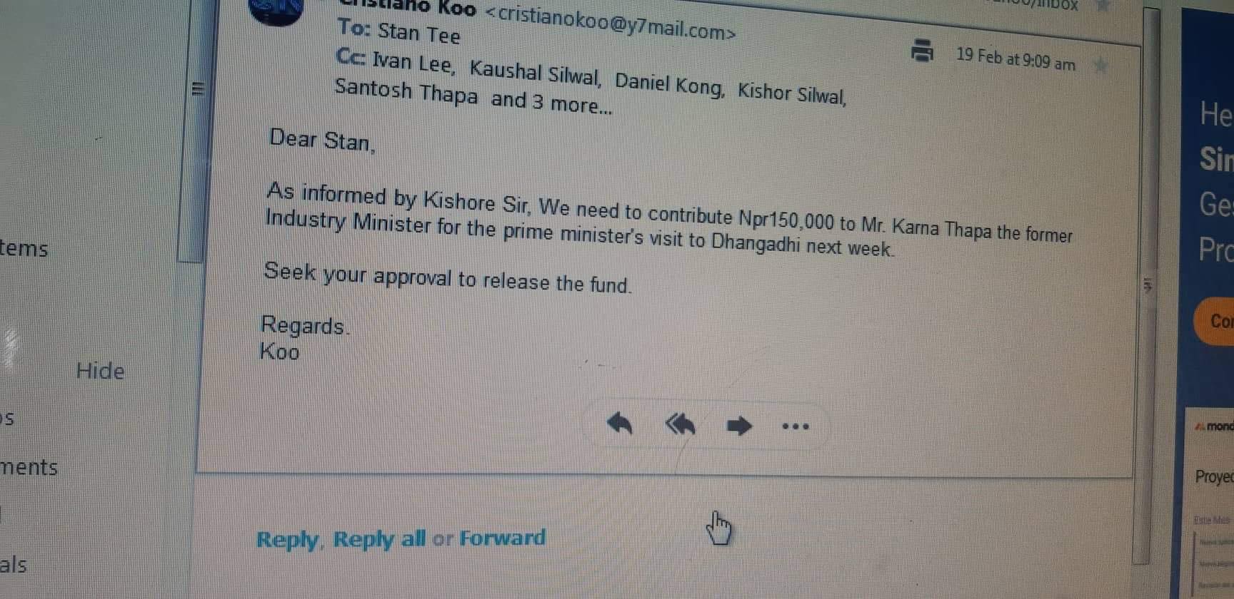 प्रधानमन्त्री केपी ओली धनगढी जाँदा प्रदेश अध्यक्ष कर्ण थापाले कैलालीकै ‘साथी’ होटलस्थित क्यासिनोबाट एक लाख ५० हजार रुपैयाँ लगेको प्रमाण भेटिएको छ । प्रजातन्त्र दिवसको दिन फागुन ७ गते बिहान ९ बजेर नौ मिनेट जाँदा क्यासिनोको तर्फबाट डेढ लाख निकासाको निम्ति म्यानेजर क्रिस्ट्यिानो कु ले, स्ट्यान टी, इभान ली, कौशल र किशोर सिल्वाल, ड्यानियल कोङ, सन्तोष थापासहितलाई पठाएको इमेलमा भनिएको छ– किशोर सरले भन्नुभएअनुसार, अर्कोे हप्ता हुने प्रधानमन्त्रीको धनगढी आगमनका निम्ति पूर्व उद्योगमन्त्री कर्ण थापालाई हामीले नेपाली रुपैयाँ एक लाख पचास हजार दिनु छ, रकम छिटो निकाशा होस् । यो पैसा प्रधानमन्त्रीको भ्रमणमै खर्च भयो या थापाको गोजीमा गयो ? प्रष्ट छैन सरकार प्रमुखको सुदूरपश्चिम यात्रासँग जुवाघर सञ्चालक विदेशी नागरिकको के सरोकार र साइनो ? यसरी थापाले प्रधानमन्त्रीको भ्रमण क्रममा ठाउँठाउँबाट ३५ लाख रुपैयाँ उठाएको स्रोतको भनाइ छ जबकि उनले पाँच लाख मात्रै उठेको बताउने गरेका छन् ।