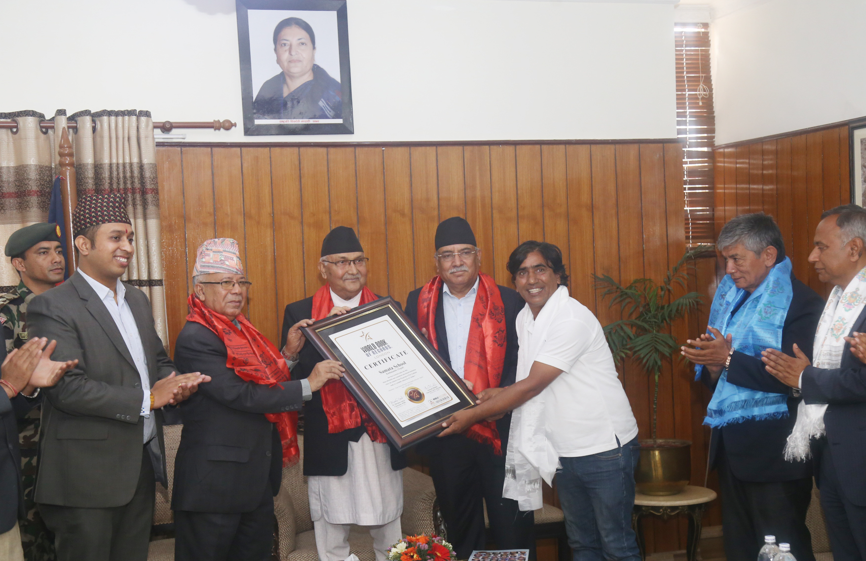 २ वैशाख, काठमाडौं । प्रधानमन्त्री केपी शर्मा ओलीले समता स्कूल काठमाडौंलाई वल्र्ड बुक अफ रेकर्डस् हस्तान्तरण गर्नुभएको छ । आज बिहान बालुवटारमा आयोजित कार्यक्रममा वल्र्डबुक अफ रेकर्डस लण्डनले जारी गरेको प्रमाण पत्र प्रधानमन्त्री ओलीले समता फाउण्डेसनका अध्यक्ष उत्तम सञ्जेललाई हस्तान्तरण गर्नुभएको हो ।
