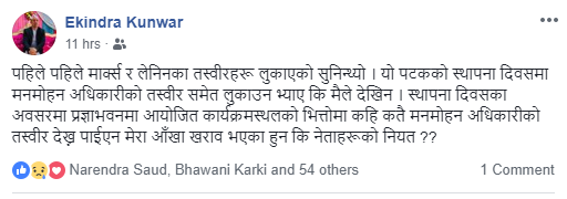हरेक सार्वजनिक कार्यक्रममा मनमोहनको तस्बीर झुण्ड्याउने एमाले नेकपा भएपछि पहिलो जननिर्वाचित कम्युनिष्ट प्रधानमन्त्रीको तस्बीर हटाएको छ । केहीदिन अघि भएको नेकपाको स्थापना दिवसको अवसरमा तयार पारिएको व्यानरमा समेत मनमोहन अटाउन सकेनन् । अाजका दिनसम्म त्यही मनमोहन सरकारले ल्याएका कार्यक्रमको जस बेचेर खाइरहेको नेकपाले अाफ्ना इतिहास मेटाउनै खोजेको जस्तो देखिन्छ ।