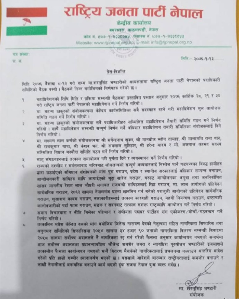 विज्ञप्ति अनुसार कात्तिक २८, २९ र ३० गते राजपाकाे महाधिवेशन हुनेछ । राजापाले महाधिवेशन सफल पार्न अध्यक्ष मण्डलका सदस्य महन्थ ठाकुरकाे संयाेजकत्वमा महाधिवेशन अायाेजक समिति गठन गरेकाे छ । राजपा बैठकले गरेका अन्य निर्णयहरु तलकाे विज्ञप्तिमा पढ्न सक्नुहुन्छ ।