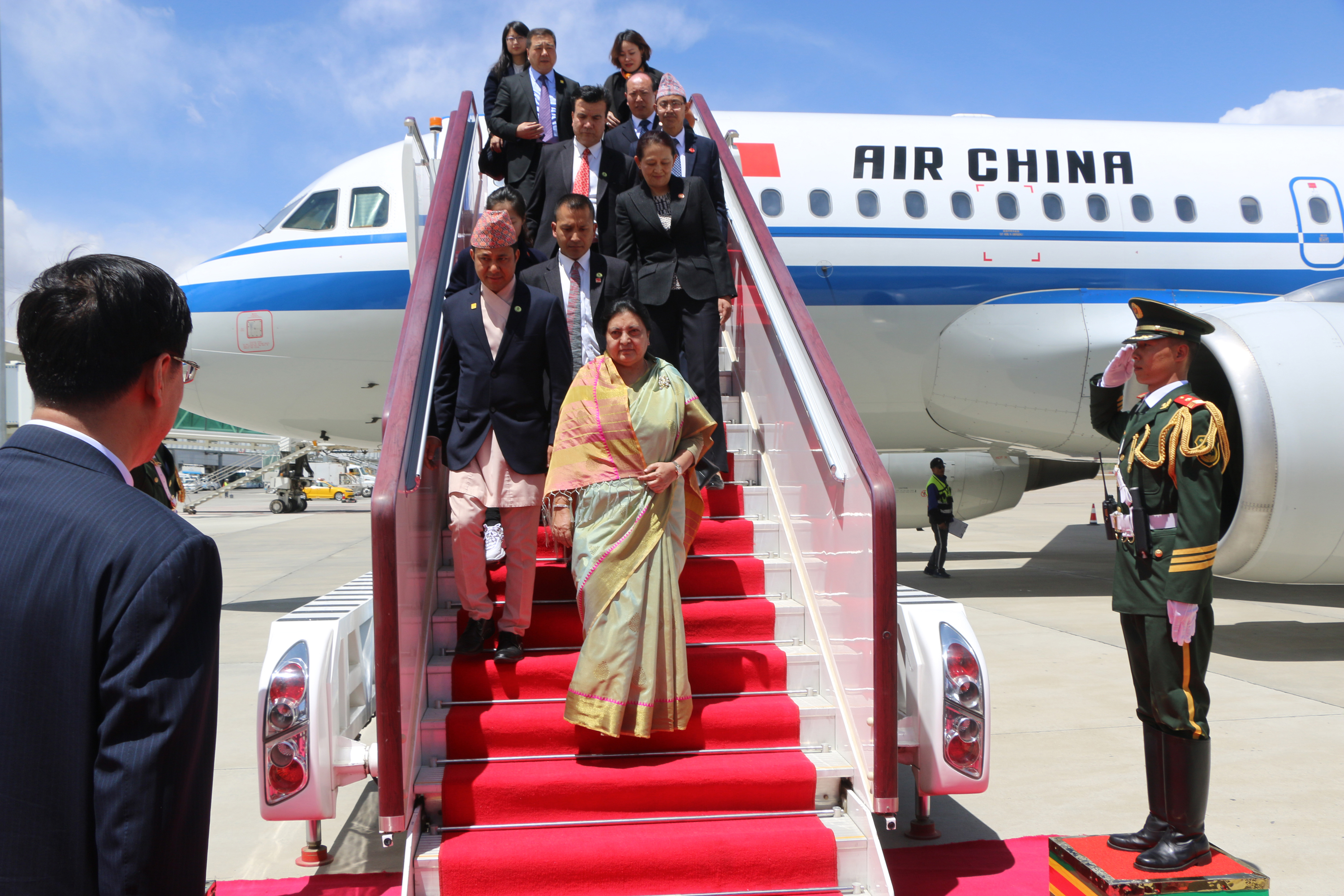 १७ वैशाख, चिन । राष्ट्रपति विद्यादेवी भण्डारी चिनियाँ समकक्षी सी चिनफिङको निमन्त्रणामा चीनको राजकीय भ्रमणका क्रममा आज बेइजिङबाट ल्हासा आइपुग्नुभएको छ । उहाँलाई ल्हासाको गोङ्गर विमानस्थलमा तिब्बत स्वशासित क्षेत्रका कार्यकारी उपाध्यक्ष चियाङ जीले स्वागत गर्नुभयो ।
