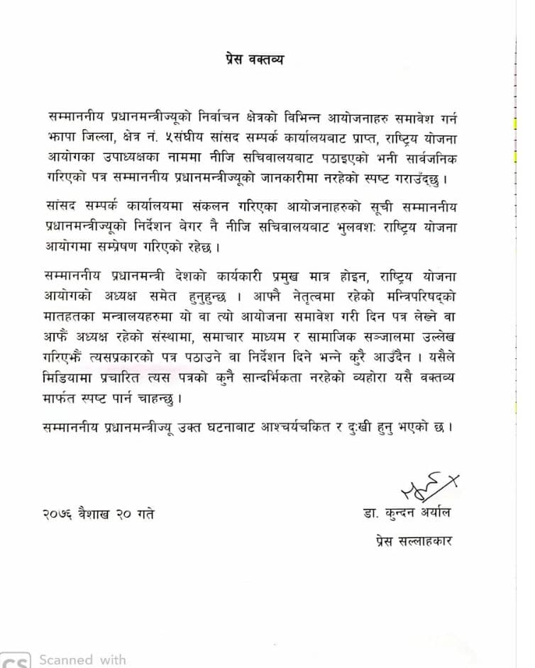 प्रधानमन्त्रीका तर्फबाट प्रेस सल्लाहकार कुन्दन अर्यालले एक विज्ञप्ति जारी गर्दै भुलवश पत्राचार भएकाे बताएका छन । अर्यालले उक्त पत्र प्रधानमन्त्री ओलीको जानकारी बेगर लेखिएको उनको स्पष्ट पारेका छन ।