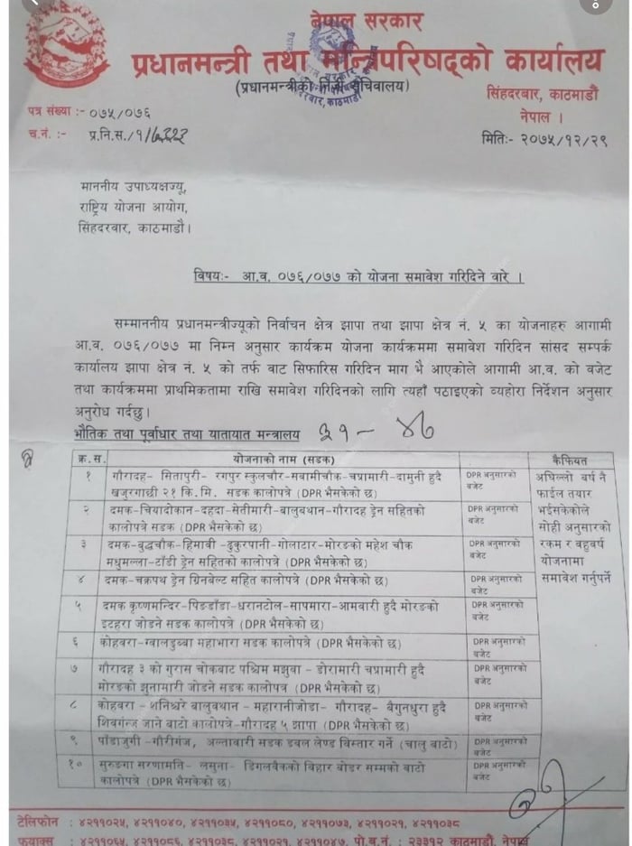 झापा क्षेत्र नम्बर ५ का योजनाहरु आगामी बजेटमा समावेश गर्न भन्दै प्रधानमन्त्रीको सचिवालयले राष्ट्रिय योजना आयोगलाई पत्र पठाएको थियो । प्रधानमन्त्री स्वयं योजना आयोगको अध्यक्ष रहेकाले यो यो आयोजना समाजेश गरिदिनु भनेर पत्र लेख्ने वा निर्देशन नदिइने अर्यालको विज्ञप्तिमा उल्लेख गरिएकाे छ ।