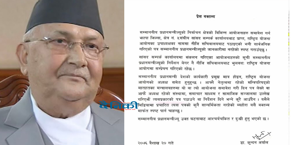 अर्यालले जारी गरेकाे विज्ञप्तिमा सचिवालयको लेटरप्याड प्रयोग गरेर राष्ट्रिय योजना आयोगलाई पत्रचार गरिएकोमा प्रधानमन्त्री ओली आश्चार्यचकित भएको उल्लेख गरिएकाे छ ।