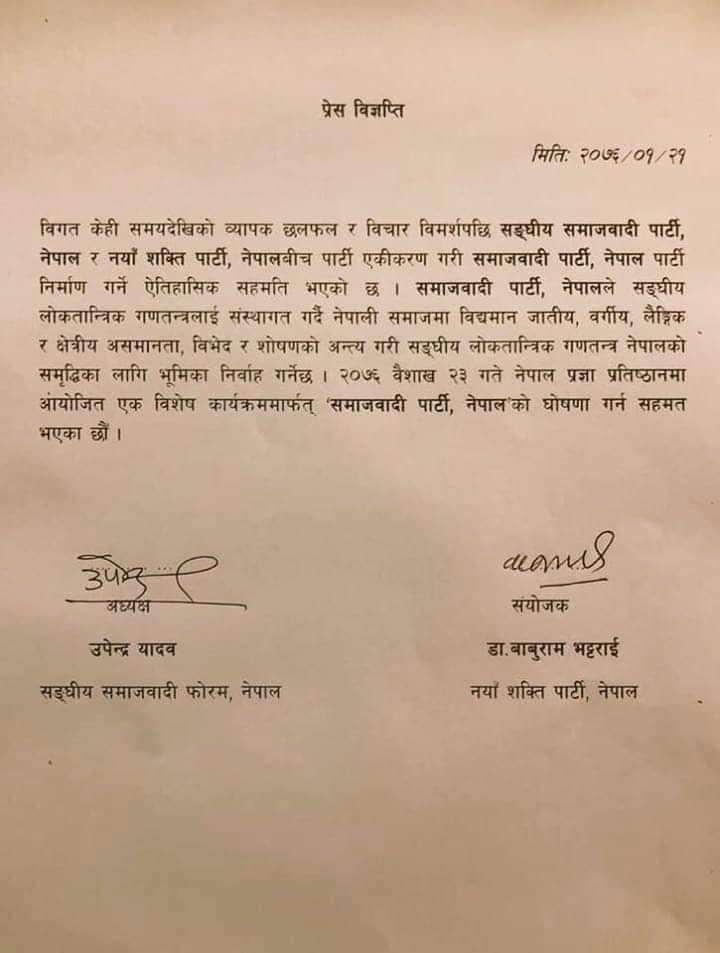 दुबै पार्टीले एकीकरणबाट समाजवादी पार्टी निर्माण गर्ने घाेषणा गरेका छन । सहमति अनुसार वैशाख २३ गते एकीकृत पार्टीको घाेषणा हुनेछ ।