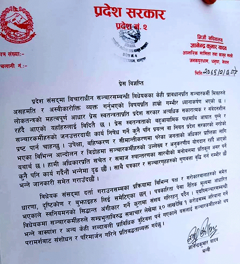 प्रदेश २ सरकार पत्रकारलाई १ करोडसम्म जरिवानाको प्रस्तावबाट पछि हट्यो