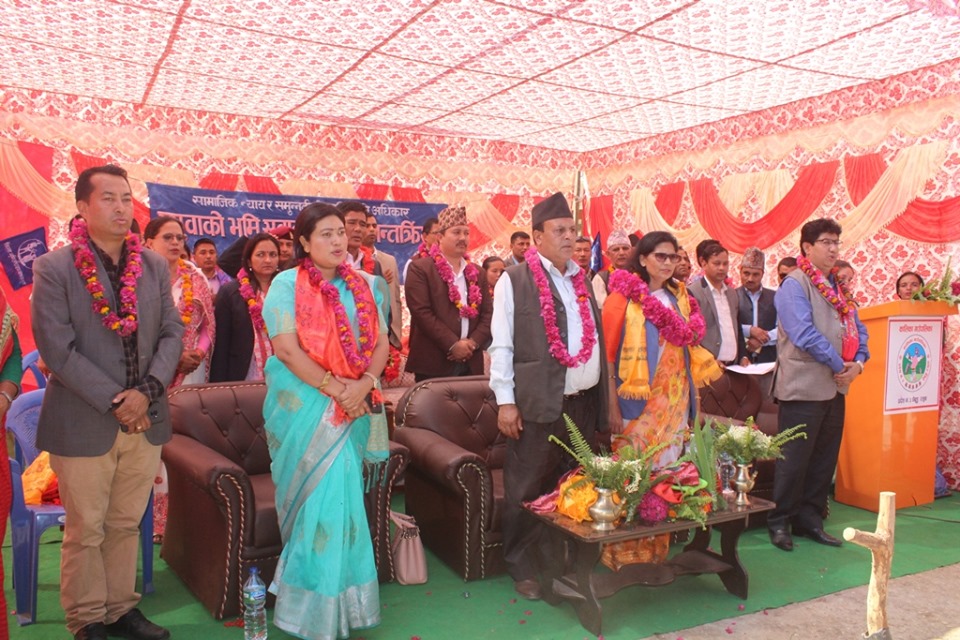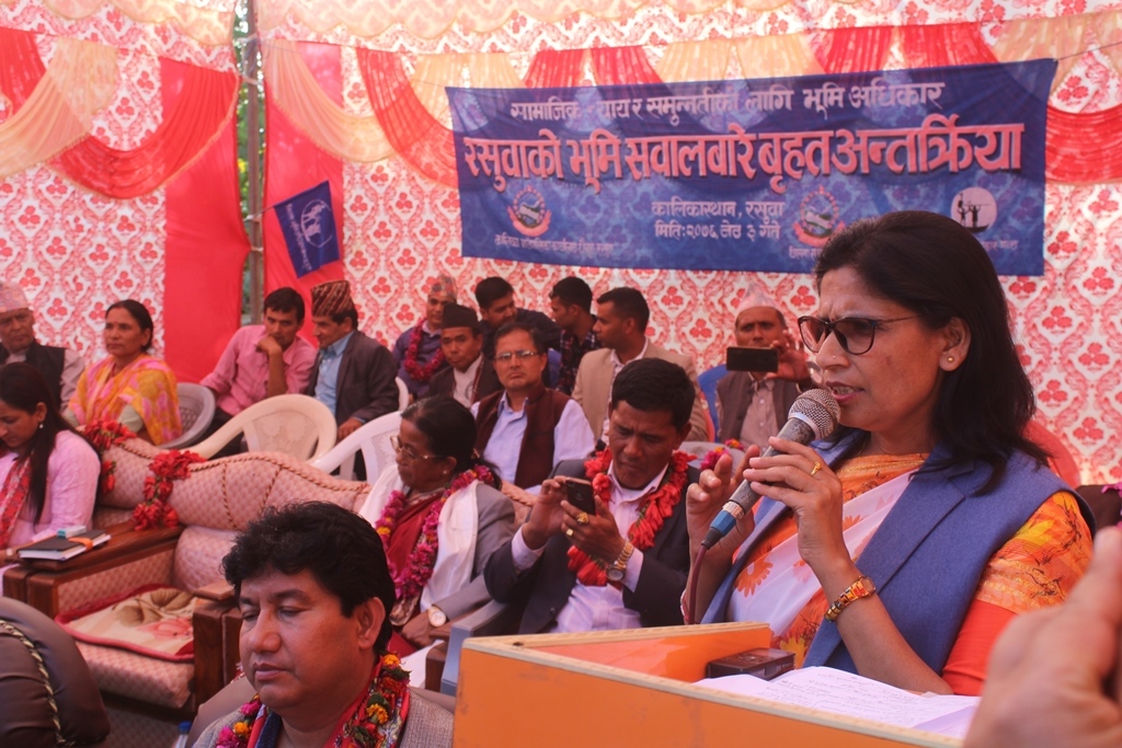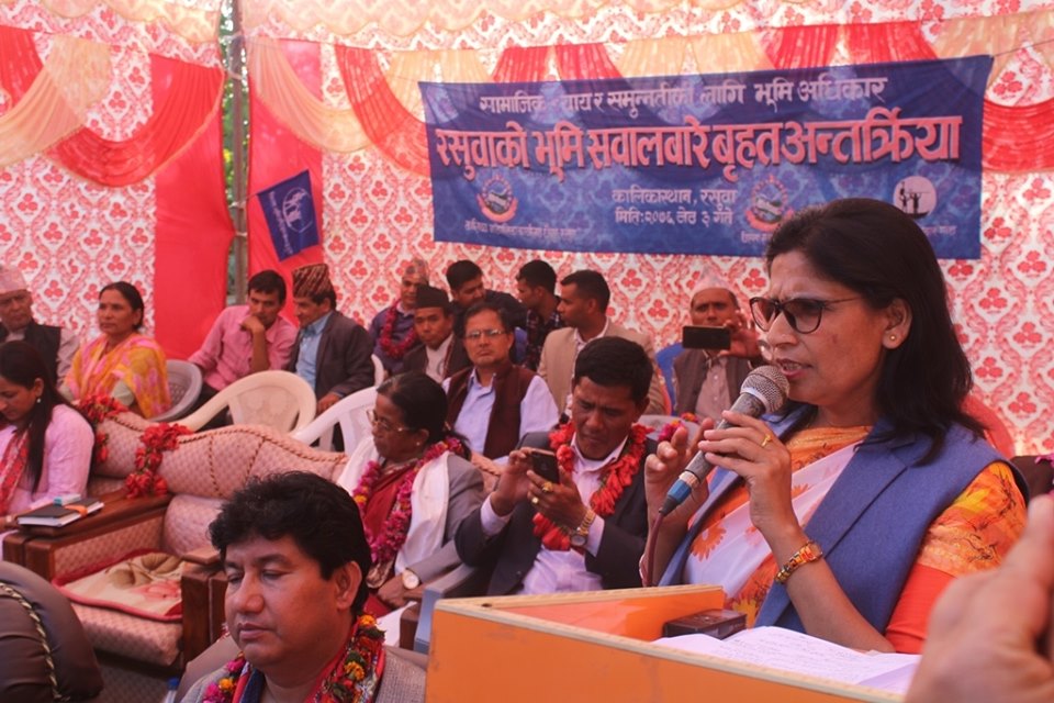 ३ जेठ, रसुवा । भूमि व्यवस्था, सहकारी तथा गरीबी निवारणमन्त्री पद्माकुमारी अर्यालले बिर्ता जग्गाको समस्या समाधान गर्न सरकारले ऐन कानून सरलिकृत गर्न लागेको बताउनुभएको छ । जिल्ला समन्वय समिति, कालिका गाउँपालिका र भूमि अधिकारमञ्च रसुवाको आयोजनामा आज यहाँ आयोजित अन्तर्क्रियामा मन्त्री अर्यालले भूमि सुधार ऐन २०७६ ले समस्याको समाधान हुने बताउनुभयो । समग्र किसानको भूमि सम्बन्धी समस्या हल गर्न आठौँ संशोधन विधेयक पेश गरेकाले कानून बनाउन समय लाग्ने हुँदा केही समय धैर्य गर्न आग्रह गर्नुभयो ।