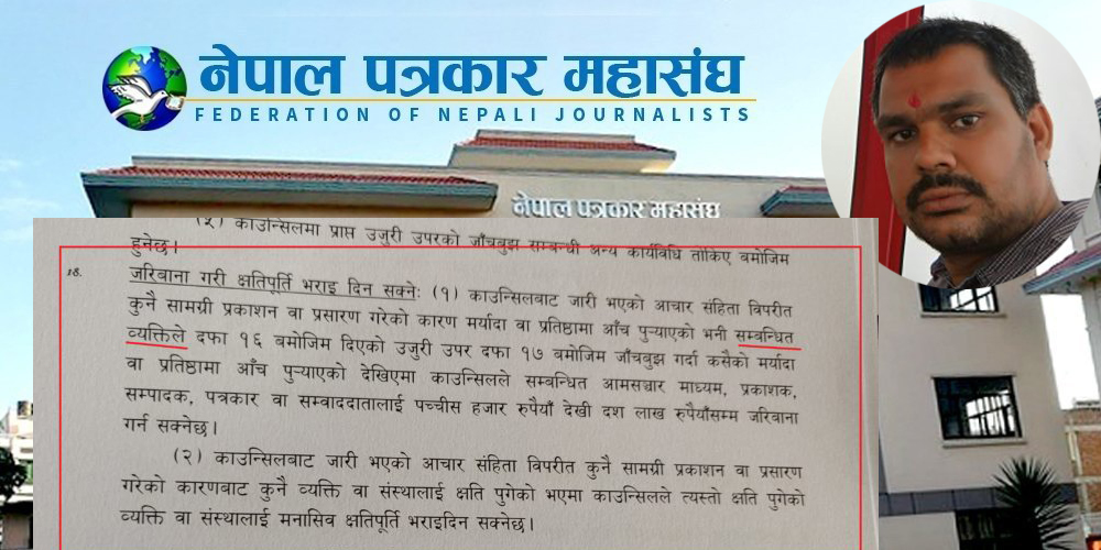 प्रस्तावित विधेयकको दफा १८ मा प्रष्ट रुपमा भनिएको छ, काउन्सिलबाट जारी भएको आचार सहिंता विपरित कुनै सामाग्री प्रकाशन वा प्रसारण गरेको कारण मर्यादा वा प्रतिष्ठामा आँच पुर्याएको भनी सम्बन्धित व्यक्तिले दफा १६ बमोजिम उजुरी दिएमा दफा १७ बमोजिम जाँचबुझ कसैको मर्यादामा वा प्रतिष्ठामा आँच पुर्याएको देखिएमा काउन्सिलले सम्बन्धित आमसञ्चार माध्यम, प्रकाशक, सम्पादक, पत्रकार वा सम्वाददातालाई २५ हजार देखि १० लाख सम्म जरिवाना गर्न सक्नेछ। अर्थात पत्रकारले जो कसैले दिएको उजुरीको आधारमा जरिवाना तिर्नु पर्दैन, सम्बन्धित व्यक्तीले नै उजुरी दिनु पर्दछ।