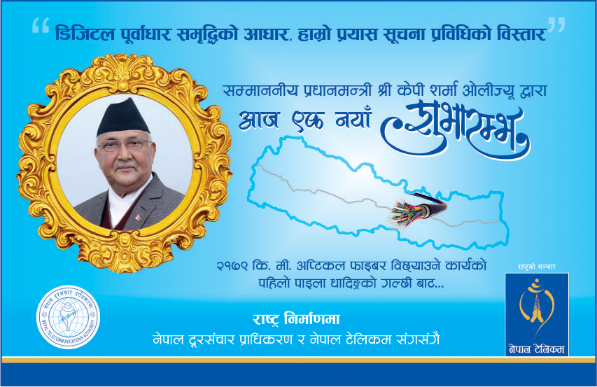 शुरुआती विन्दु पाँचथरदेखि अन्तिम विन्दु बैतडीसम्म सूचना महामार्गको विस्तारले डिजिटल नेपाल बनाउन सहयोग पुग्ने विश्वास लिइएको छ । उक्त सूचना महामार्गको आज गल्छी गाउँपालिका–४ मासटारमा प्रधानमन्त्री केपी शर्मा ओलीले शिलान्यास गर्नुभयो । सरकारले अघि सारेको ‘समृद्ध नेपाल सुखी नेपाल’को नारालाई सार्थक तुल्याउने उपयुक्त माध्यम सूचना र प्रविधि हो । विश्वलाई एउटा कुनामा सीमित पारिदिन आधुनिक सूचना प्रविधिको उच्चतम प्रयोगबाटै समृद्धिको यात्रालाई सार्थक बनाइने अपेक्षा गर्न सकिन्छ । सरकारले देशैभर उच्च गतिको ब्रोडब्यान्ड इन्टरनेटको पहुँच पु¥याउँदै डिजिटल नेपालको आधार तयार गर्ने लक्ष्यका साथ हरेक जिल्लासम्म अप्किटल बिछ्याउने परियोजना अघि सारेको थियो ।