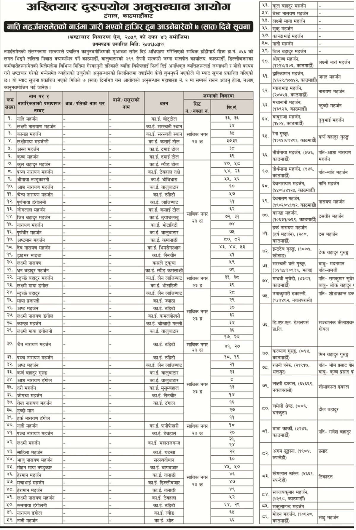 बालुवाटार जग्गा प्रकरणमा मुछिएका ८६ जनालाई अख्तियारको ७ दिने सूचना (नामावलीसहित)