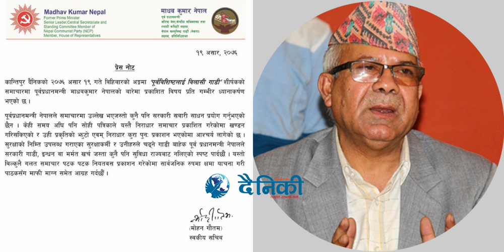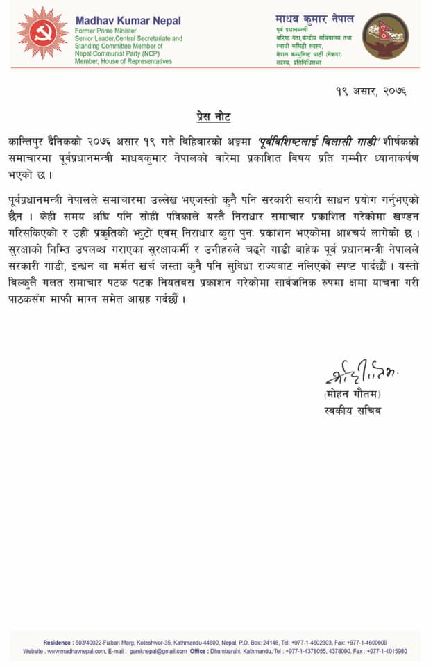 पूर्वप्रधानमन्त्री नेपालका स्वकिय सचिव मोहन गौतमले विज्ञप्ति प्रकाशित गरी माधव नेपालले कुनै पनि सरकारी सुविधाको दुरूपयोग नगरेको र समाचारमा भनिएजस्तो विलाशी गाडीको सुविधा नलिएको बताएका छन । उनले यसअघि पनि माधव नेपालको बारेमा गलत समाचार प्रकशित गरेको भन्दै पटक पटक नेपालकाविरूद्धमा नियोजित रूपमा समाचार प्रकाशित हुँदा आश्चर्यमा परेको बताएका छन । उनले प्रकाशन गरेको विज्ञप्ति यस्तो छ ।