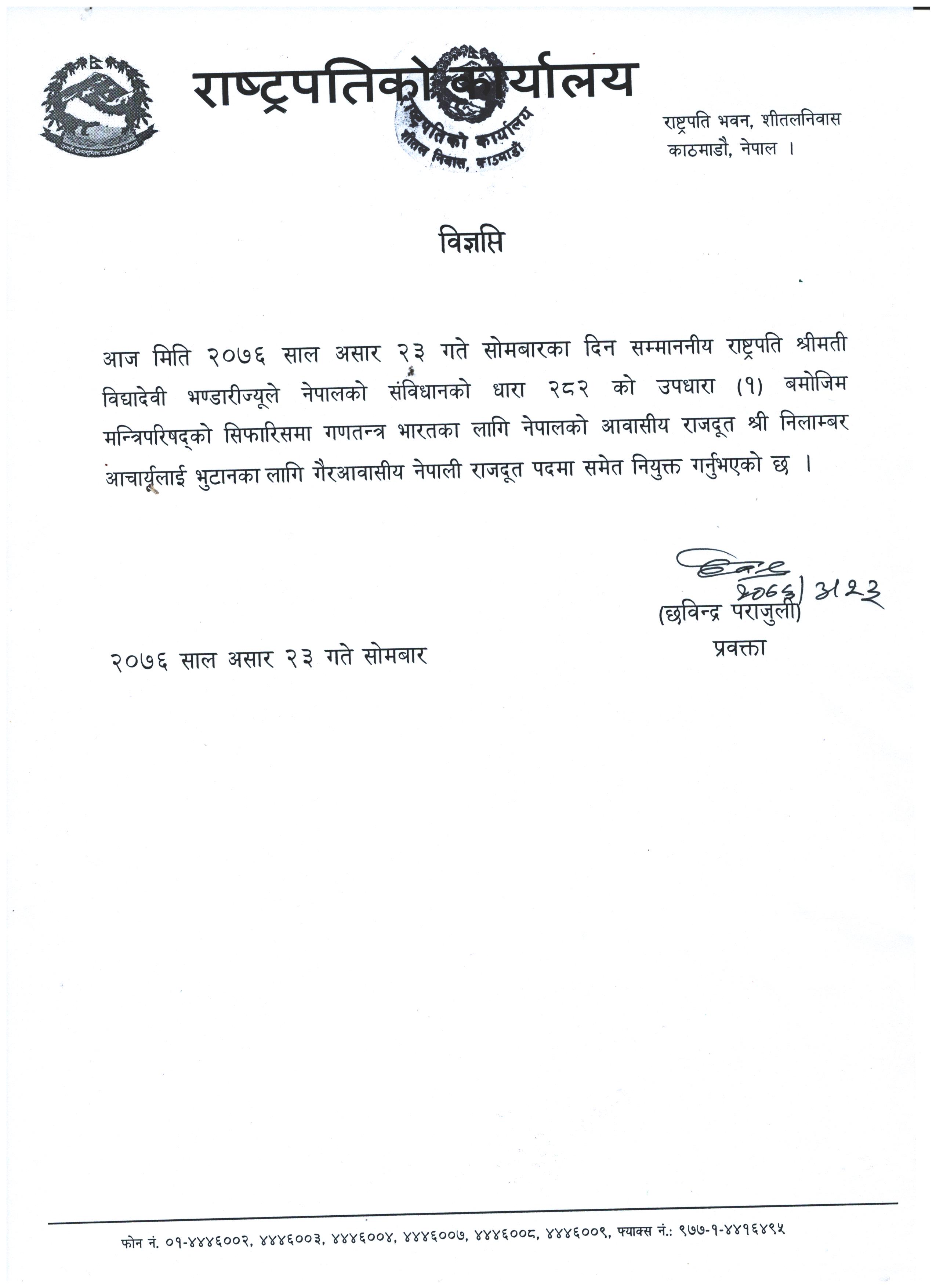 राष्ट्रपति भण्डारीले भारतका लागि नेपालको आवसीय राजदूतसमेत रहनुभएका आचार्यलाई भुटानका लागि गैरआवासीय नेपाली राजदूत पदमा नियुक्त गर्नुभएको हो । नेपालको संविधानको धारा २८२ को उपधारा (१) बमोजिम मन्त्रिपरिषद्को सिफारिसमा आचार्यलाई राजदूत पदमा नियुक्त गरिएको हो ।