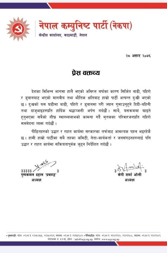 नेकपाका अध्यक्षद्वय केपी शर्मा ओली र पुष्पकमल दाहाल, प्रचण्डले शनिबार बिज्ञप्ती जारी गरी बाढी पहिरोबाट भएको जनधनको क्षतीप्रति गहिरो दुःख प्रकट गर्दै नेता कार्यकर्तालाई उद्धार तथा राहतमा जुटन निर्देशन दिएका छन । विज्ञप्तिमा भनिएको छ ‘पीडितहरुको उद्धार र राहत कार्यमा सरकारका तर्फबाट आवश्यक पहल भइरहेकै छ । हामी हाम्रो पार्टीका सवै तहका कमिटी, नेता कार्यकर्ता र जनसंगठनहरुलाई पनि उद्धार र राहत कार्यमा सक्रियतापुर्वक जुटन निर्देशित गर्दछौं।’ अबिरल बर्षाका कारण सिर्जित क्षतीप्रति दुवै नेतादे खुःख ब्यक्त गर्नुभएको छ ।