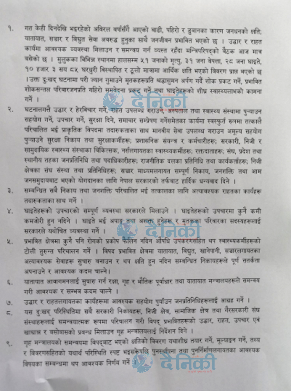 बास्कोटाको अनुसार मन्त्रिपरिषद् बैठकले अविरल वर्षासँगै आएको बाढी पहिरो र डुबानबाट पीडित भएका नागरिकहरुलाई तत्काल राहत उपलब्ध गराउने निर्णय पनि गरेको छ । सरकारले राहत कोषबाट रकम अपुग भए सरकारले रकम थप गर्ने निर्णय समेत गरेको मन्त्री बास्कोटाले जानकारी दिए । बाढी र पहिरोका कारण देशभर अहिलेसम्म ५१ जनाको मृत्यु भएको छ ।