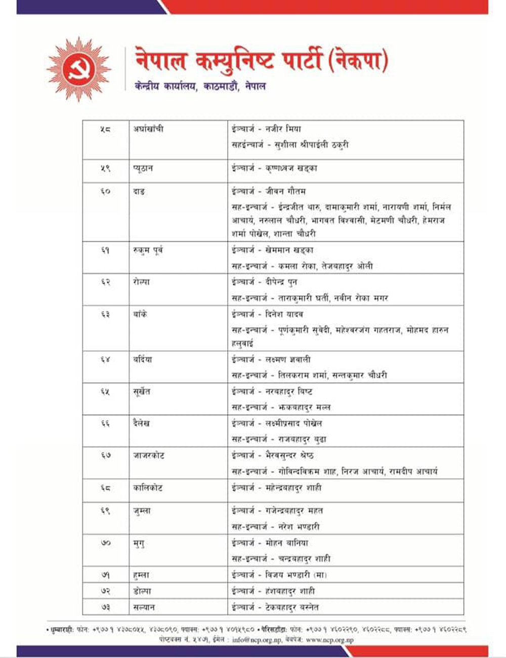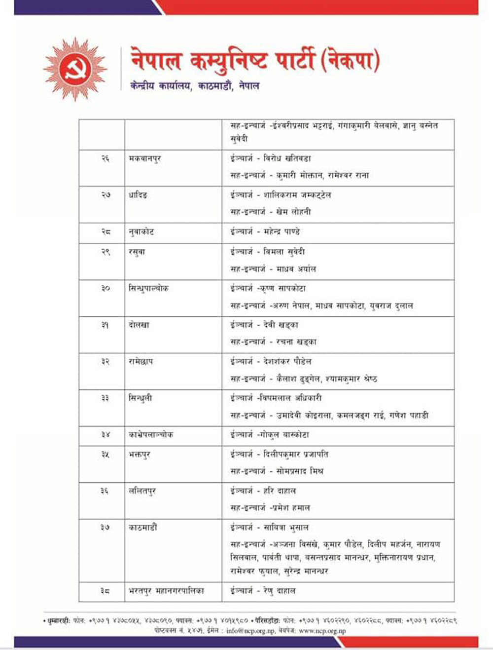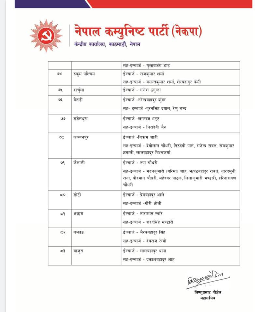 यी हुन नेकपाको ७७ जिल्ला र महानगरमा तोकिएका इन्चार्ज र सहइन्चार्ज (सूचीसहित)