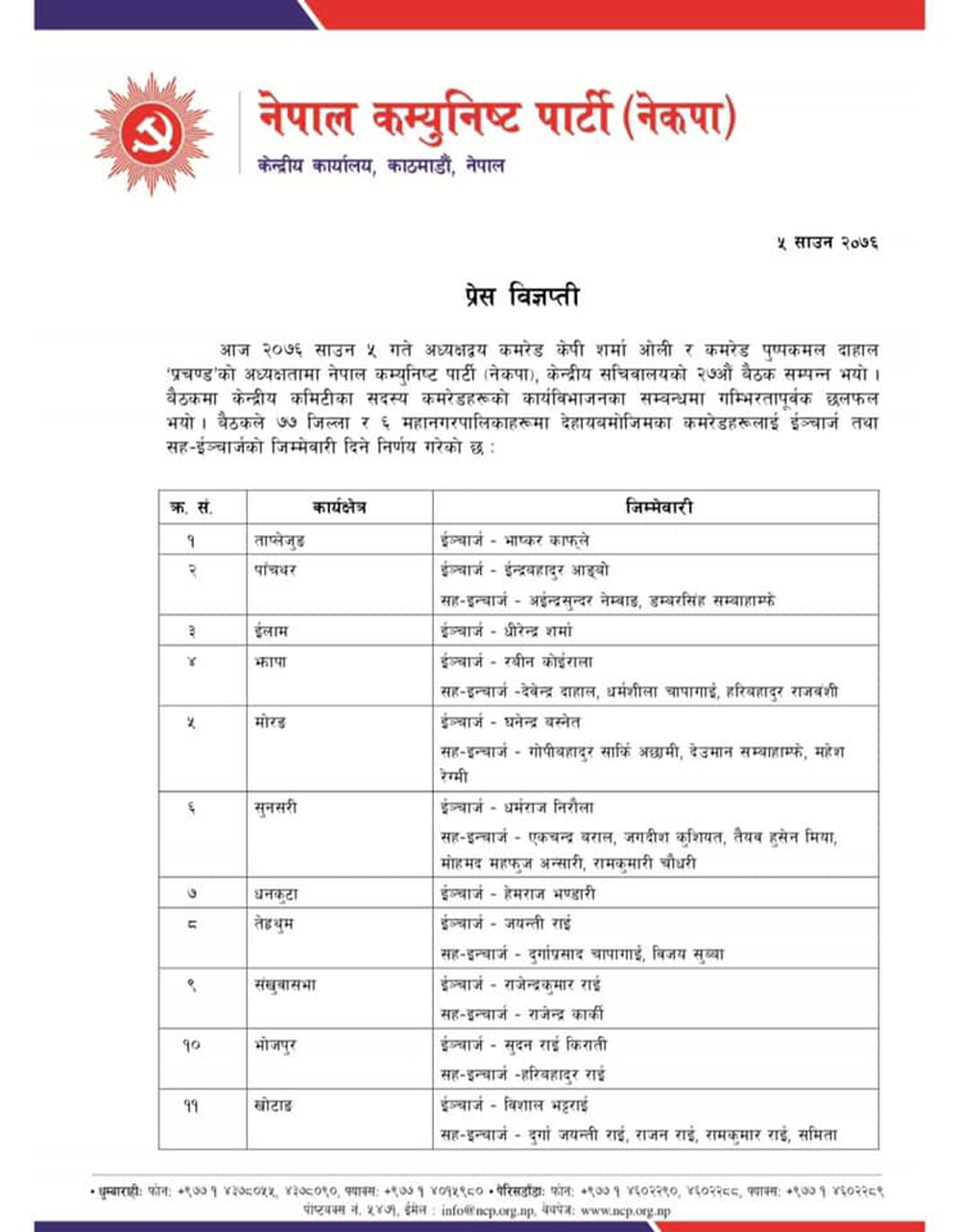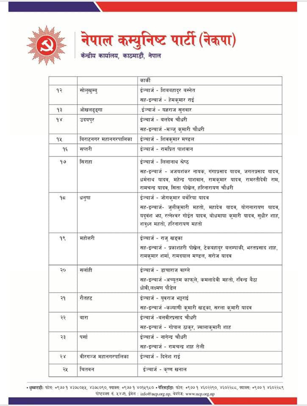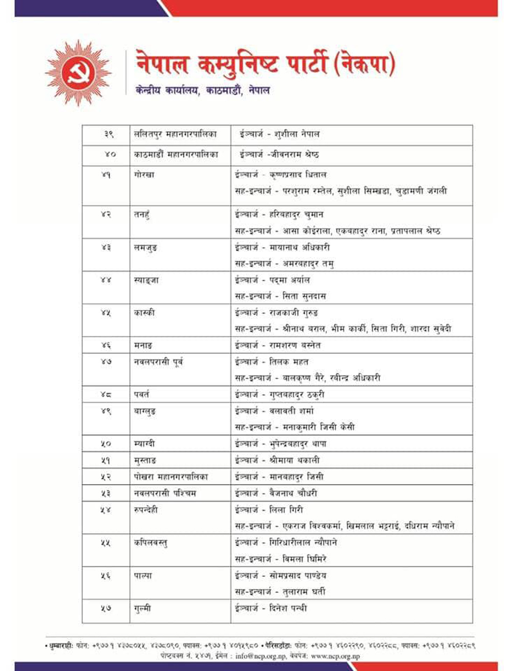 यी हुन नेकपाको ७७ जिल्ला र महानगरमा तोकिएका इन्चार्ज र सहइन्चार्ज (सूचीसहित)