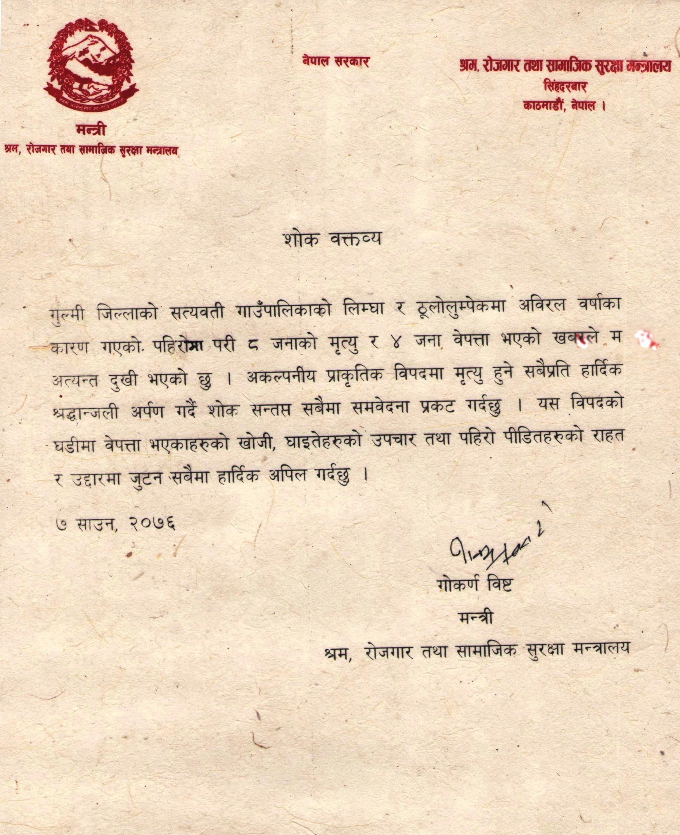 ज्ञवालीले पहिरोमा आफन्त गुमाएका परिवारलाई समवेदना प्रकट गर्दै मृतकप्रति श्रद्धाञ्जली व्यक्त गरेका छन । मन्त्री ज्ञवालीले विपद्को यस घडीमा सबै जना सतर्क भएर बस्न र उद्धार कार्यमा जुट्न आग्रहसमेत गरेका छन । यस्तै श्रम रोजगार तथा सामाजिक सुरक्षामन्त्री गोकर्ण विष्टले एक विज्ञप्ति मार्फत दुःख प्रकट गरेका छन । पहिरोबाट ज्यान गुमाउनेप्रति श्रद्धाञ्जली व्यक्त गर्दै मन्त्री विष्टले घाइतेको उपचार र राहतमा जुट्न अपिल गरेका छन । यस्तै गुल्मी क्षेत्र नम्बर १ का प्रदेशसभा सदस्य एवं ५ नम्बर प्रदेशका सामाजिक विकास मन्त्री सुदर्शन बराल पनि राहत सामग्रीसहित मंगलबार बेलुका नै पहिरो प्रभावित क्षेत्रमा पुगेका छन ।