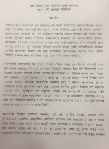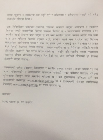 श्रम, राेजगार तथा सामाजिक सुरक्षा मन्त्रालयले बिहीबार पत्रकार सम्मेलनकाे आयाेजना गरी विवरण प्राप्त भएकाे ५९९ स्थानीय तहमा १ लख ७५ हजार ९०९ वेराेजगारले राेजगारी पाएकाे जनाएकाे छ । ती स्थानीय तहमा औसतमा १३ दिनसम्म वेराेजगाररुले राेजगारी पाएकाे श्रम मन्त्रालयले जनाएकाे छ । उल्लेखित विवरण साउन १५ गतेसम्म मन्त्रालयमा प्रप्त रहेकाे प्रवक्ता डा नारायण रेग्मीले जानकारी दिए ।